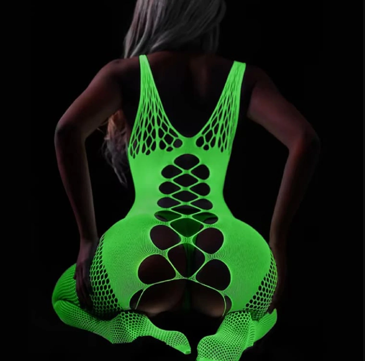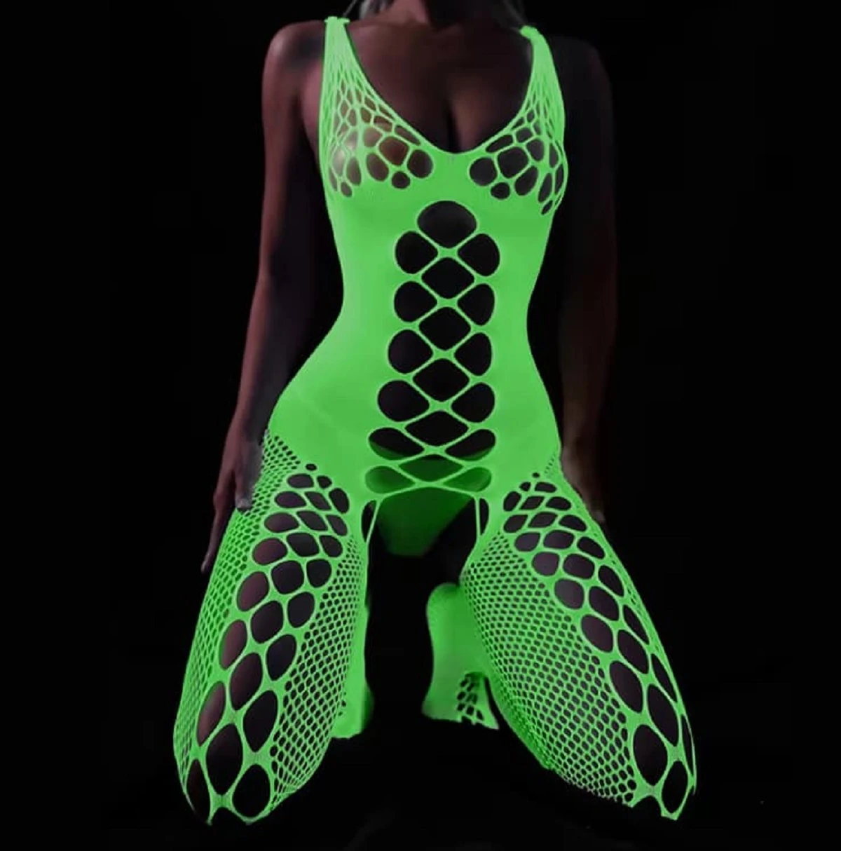 Светите этой ночью! Раскройте свою внутреннюю богиню с помощью этого потрясающего нижнего белья. Боди-комбинезон "Shelly" изготовлен из сетки с геометрическим рисунком, имеет доступ в интимном месте. Благодаря универсальному размеру, комбинезон подойдет практически на любую фигуру! При дневном цвете изделие имеет белый цвет, в темноте меняет на флуоресцентный зелёный. Светящиеся в темноте изделия необходимо зарядить солнечным светом несколько часов, прежде чем наслаждаться ими в темноте. Состав: 90% полиамид, 10% эластан. Размер S/L. Цвет: белый.