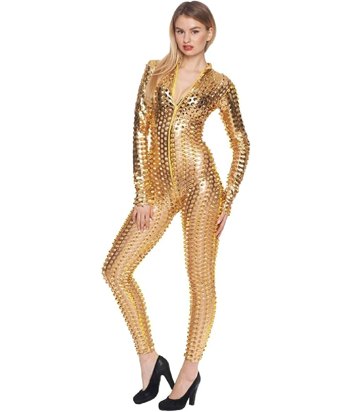 Золотой боди комбинезон Тефия с перфорацией отлично подчёркивает фигуру и придаёт образу женственности. Застежка-молния идет от шеи до нижней части спины, для легкого доступа. Идёте ли Вы на свидание или блистаете на вечеринке-Вы всегда будете в центре внимания! Состав — 90% полиамид, 10% эластан. Размер XL. Цвет: золотистый.