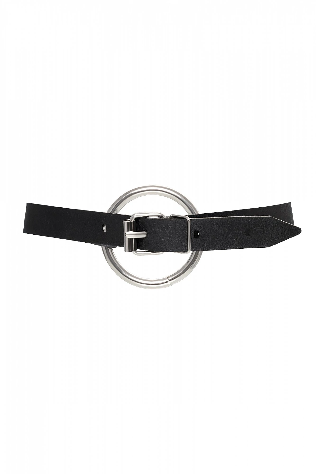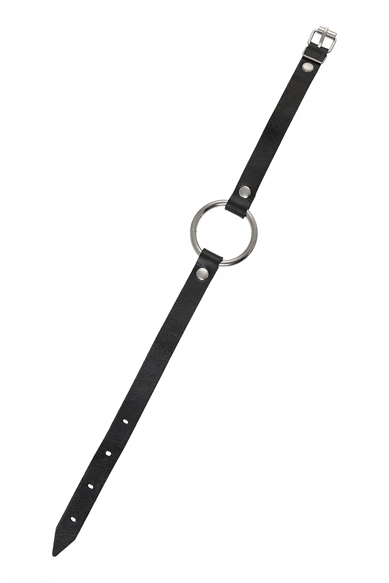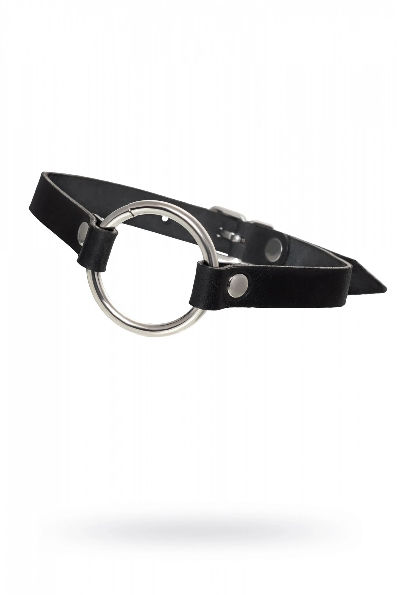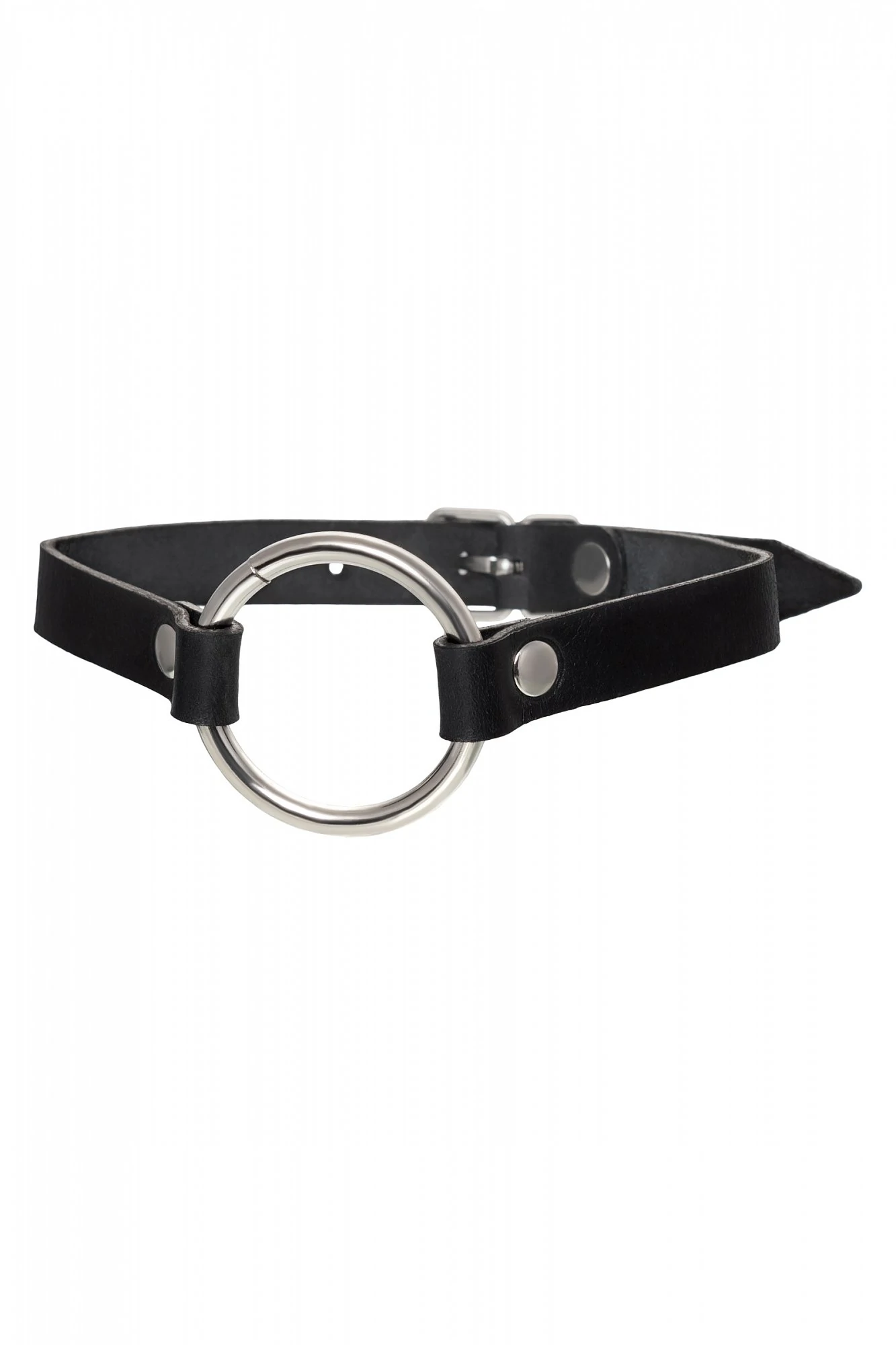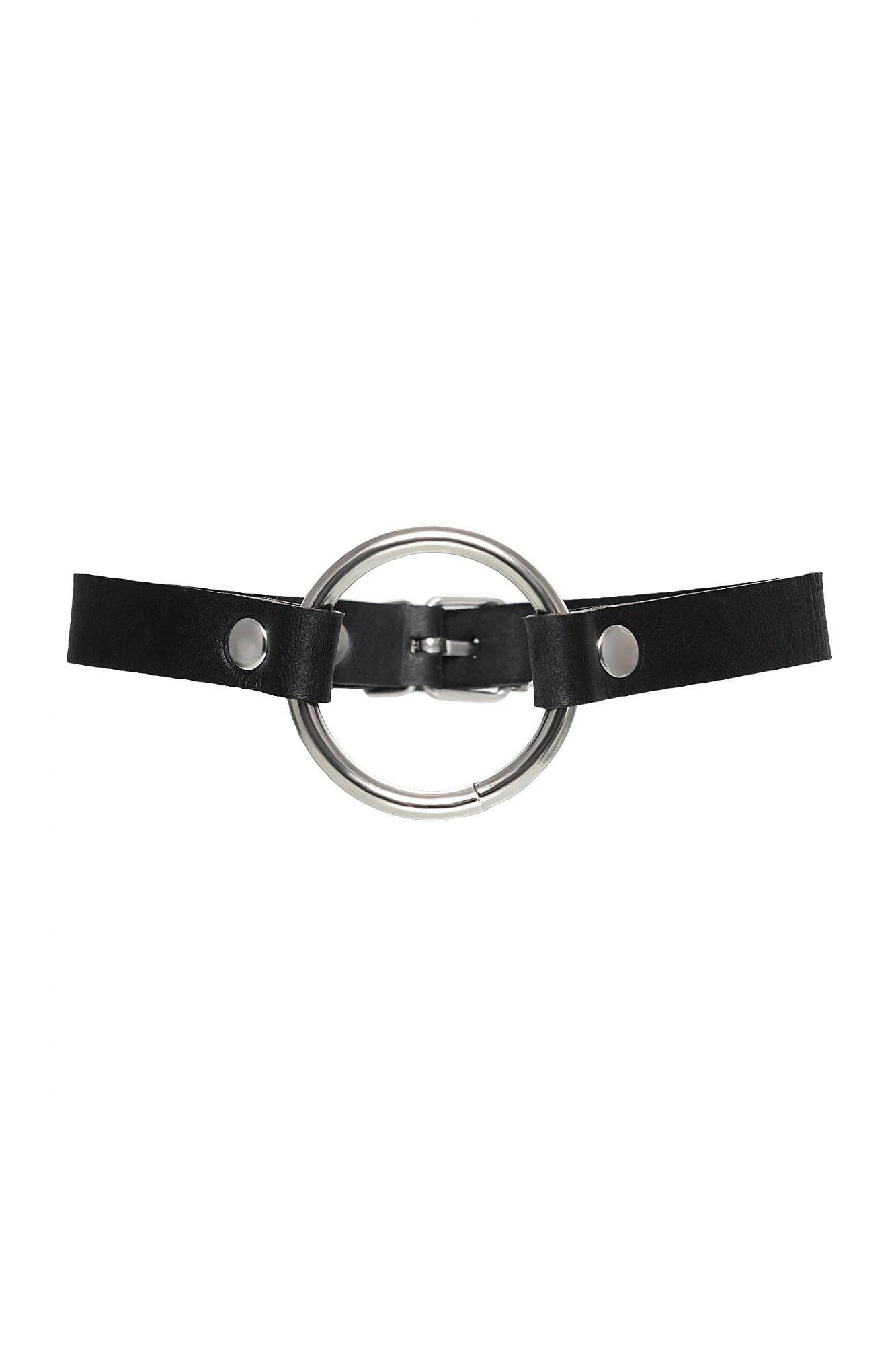 Чокер из натуральной кожи, декорирован кольцом. Регулируется при помощи ремешка. Размер универсальный. Цвет чёрный.