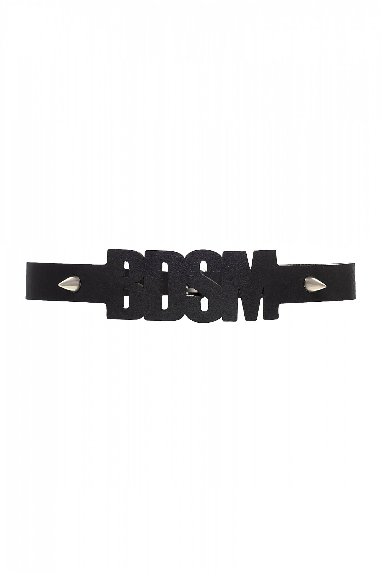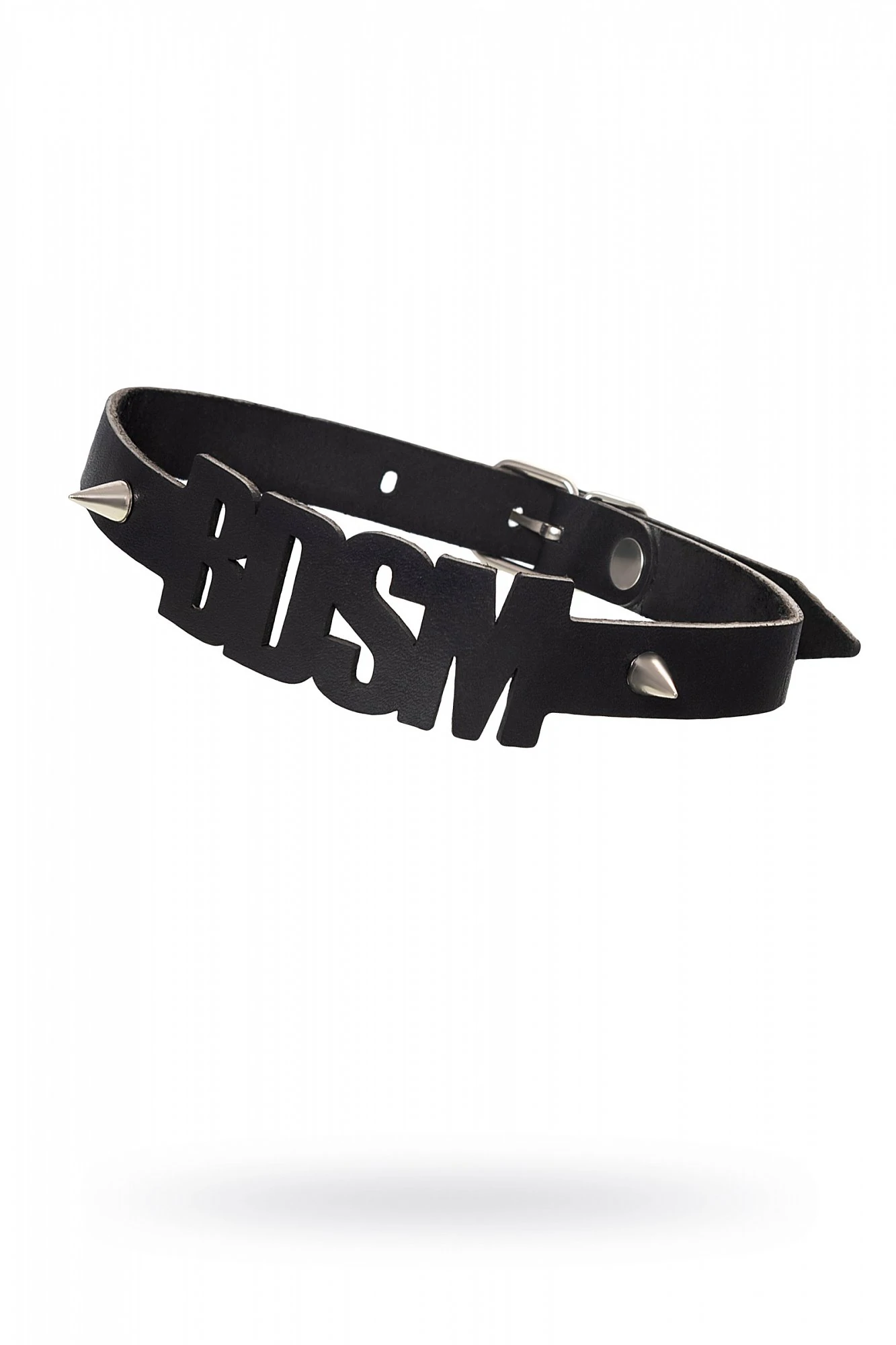 Чокер из натуральной кожи, декорирован шипами. Регулируется при помощи ремешка. Размер универсальный. Цвет чёрный.