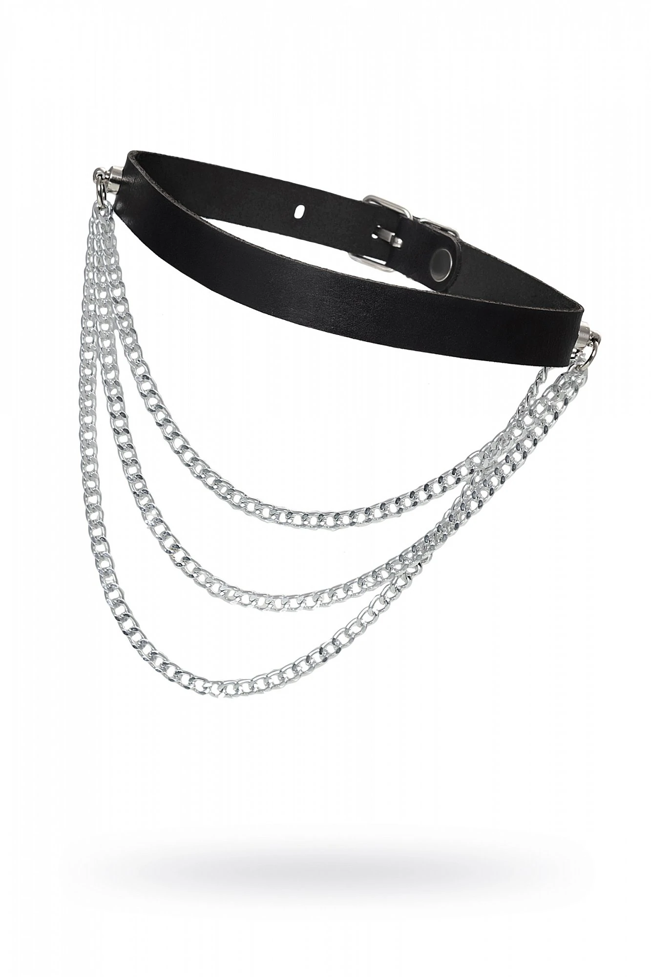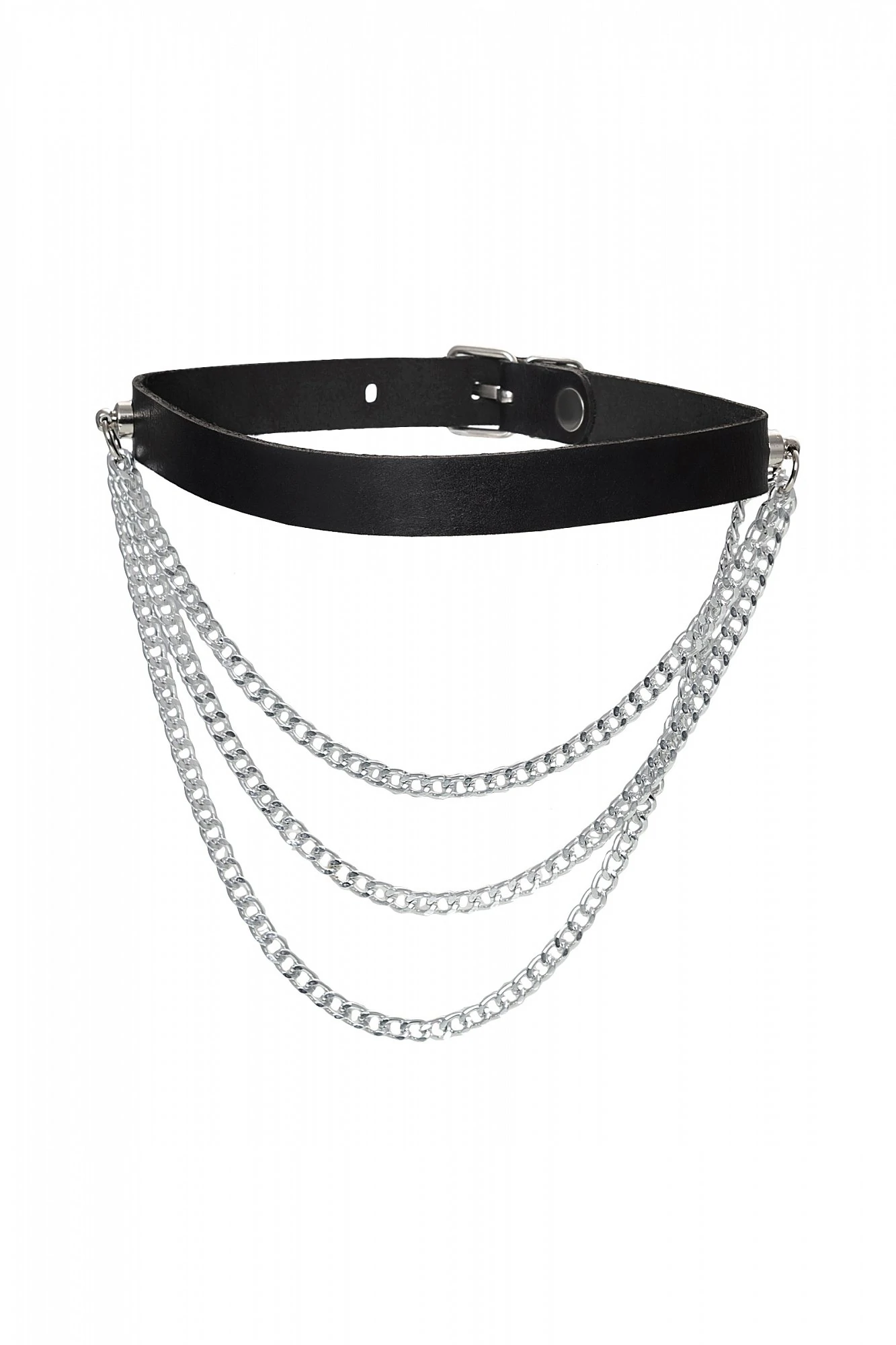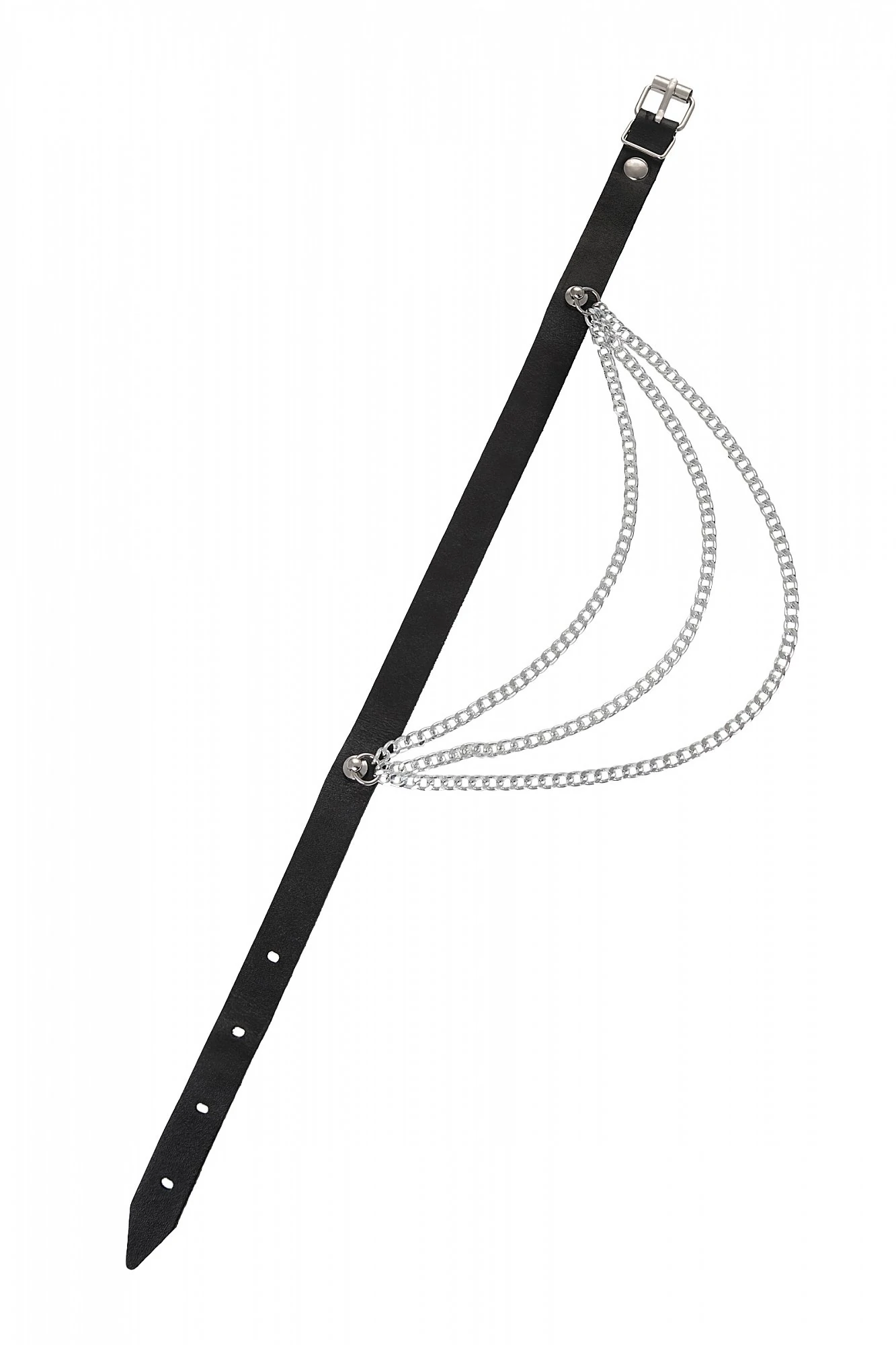 Чокер из натуральной кожи, декорирован цепочками. Регулируется при помощи ремешка. Размер универсальный. Цвет чёрный.