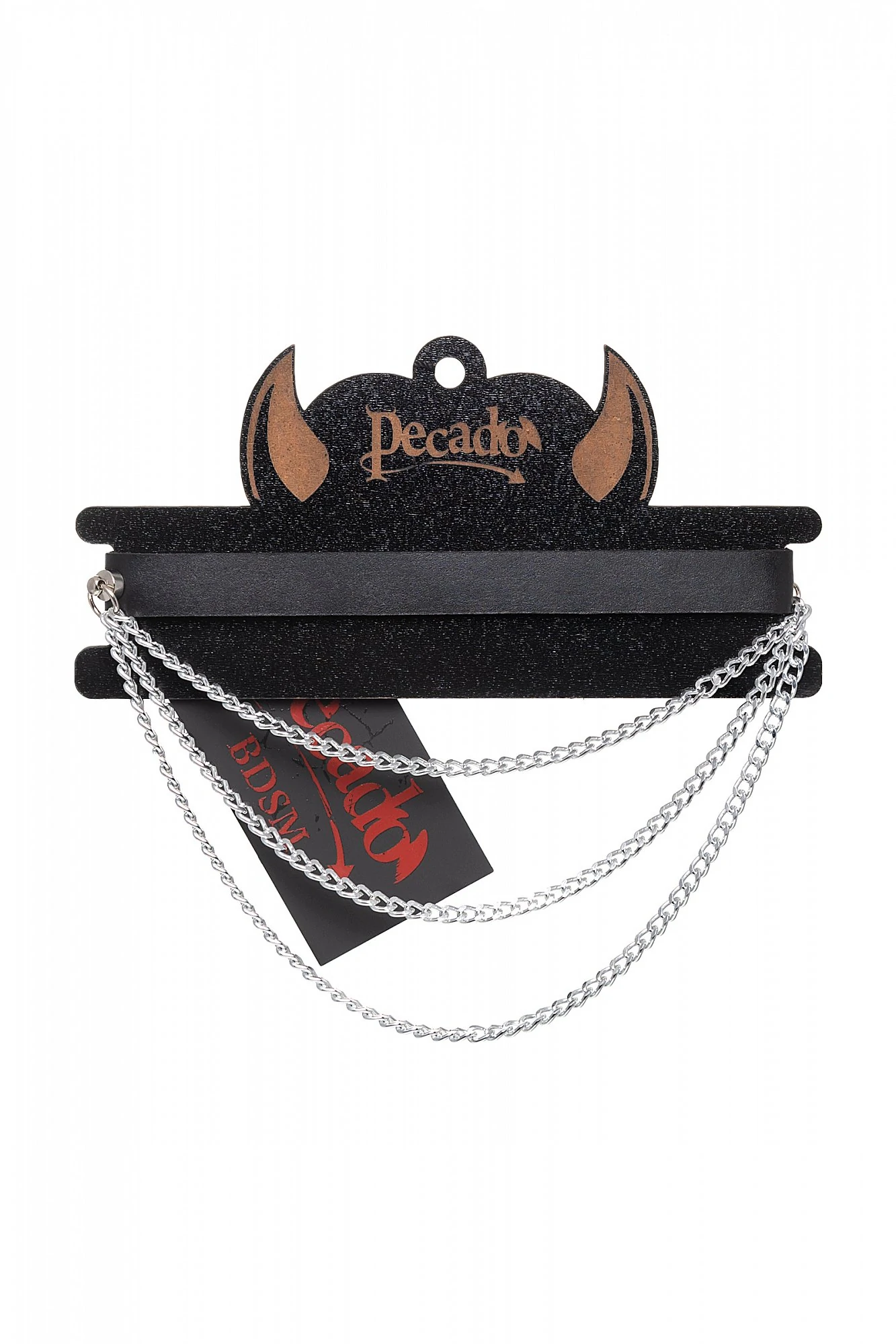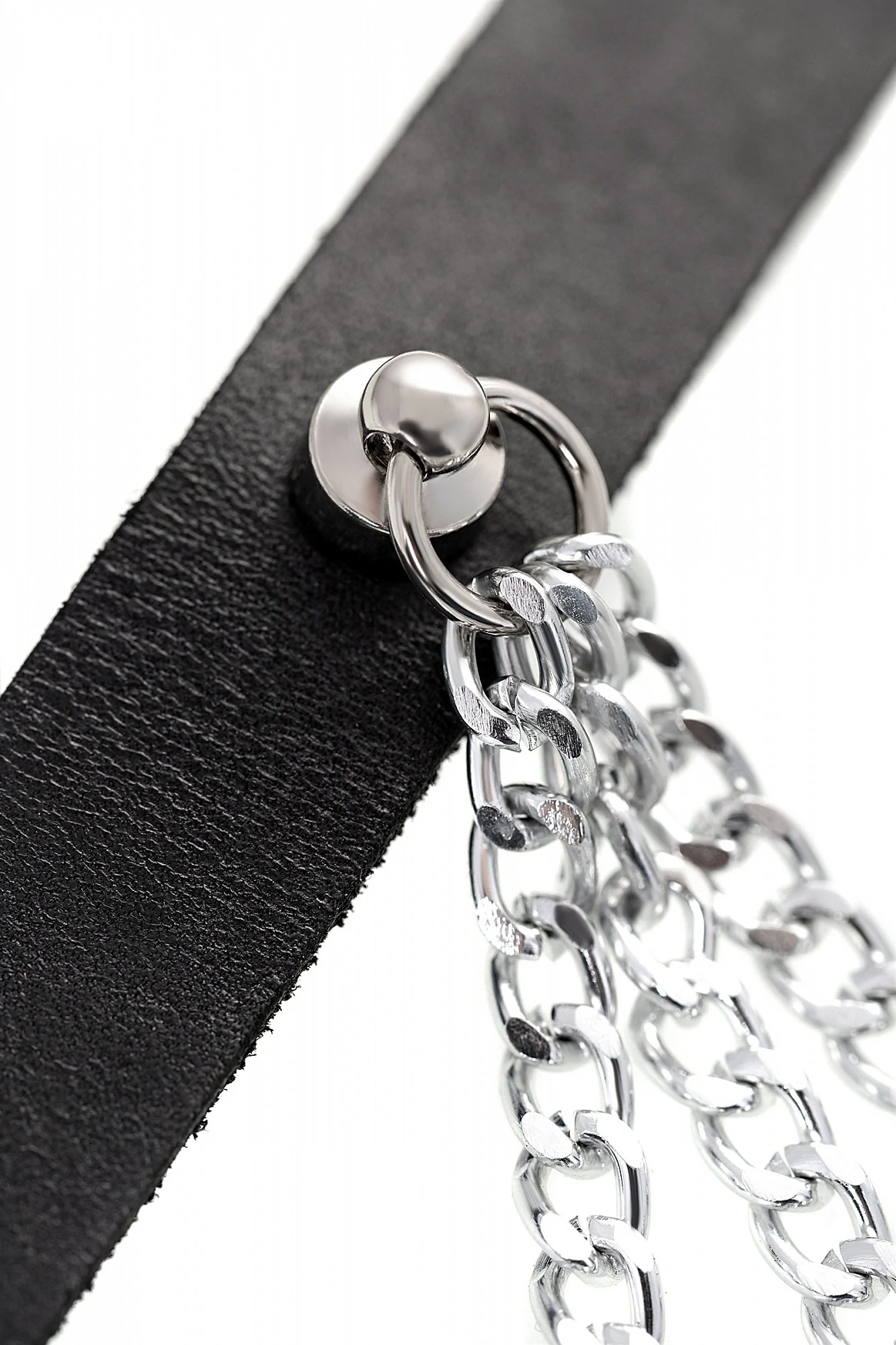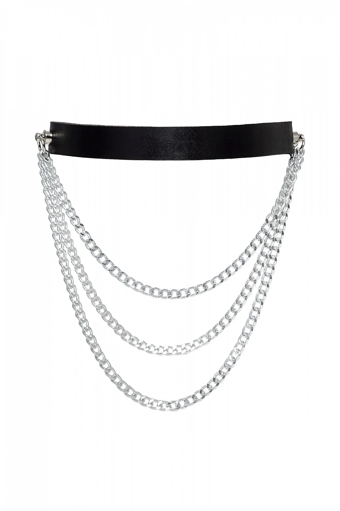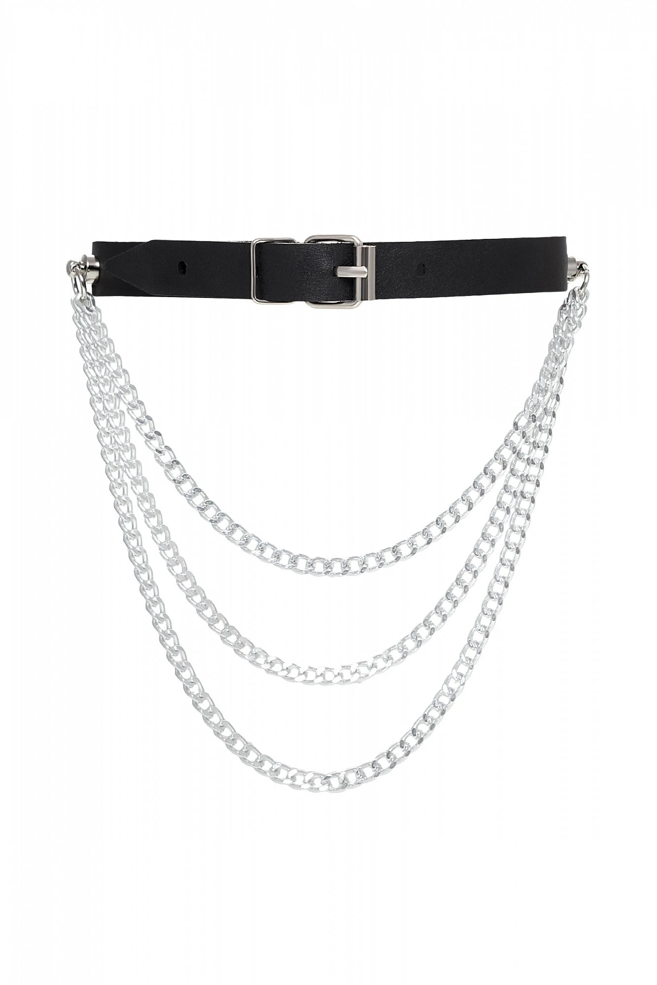 Чокер из натуральной кожи, декорирован цепочками. Регулируется при помощи ремешка. Размер универсальный. Цвет чёрный.