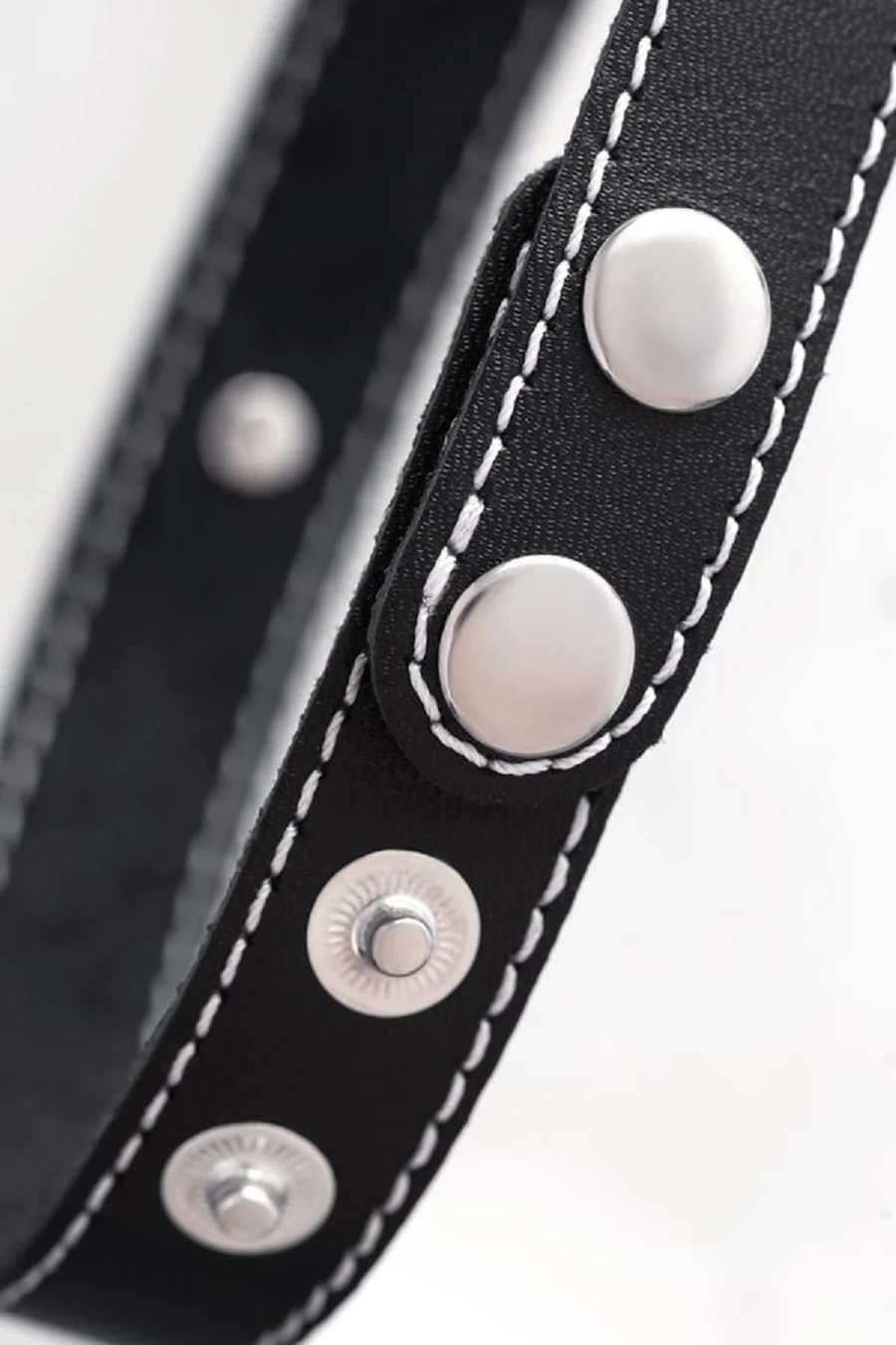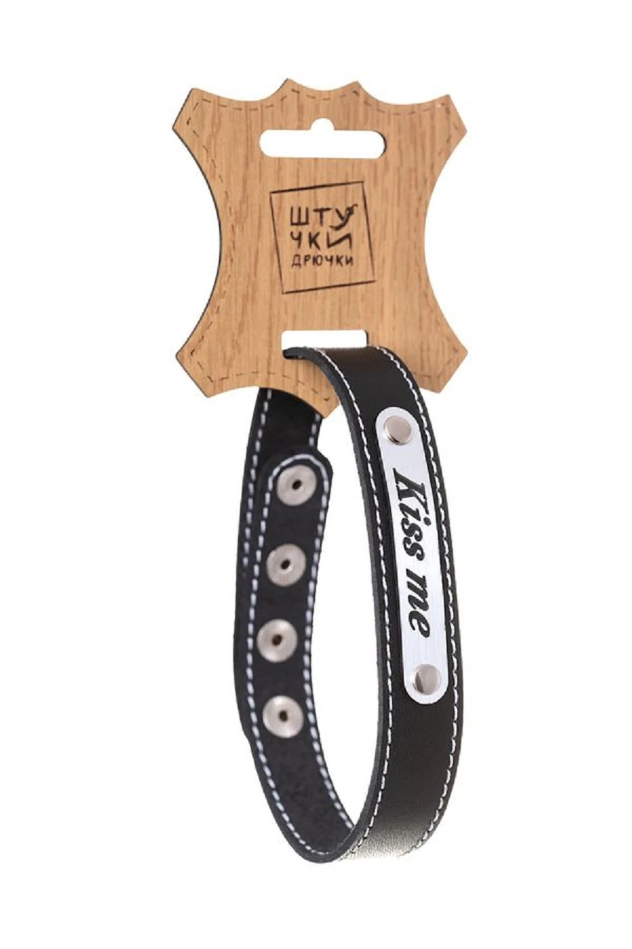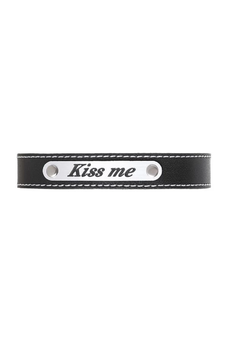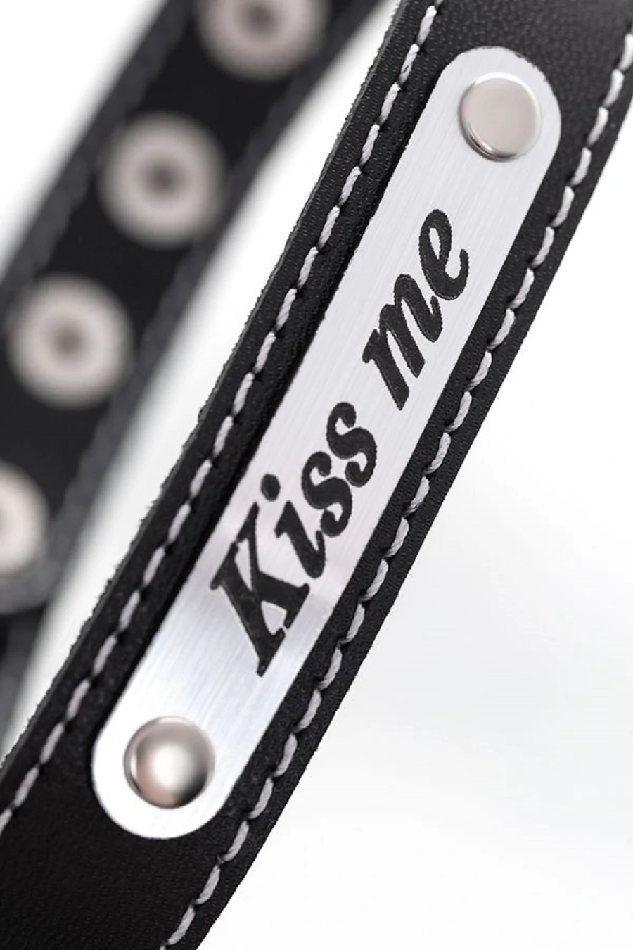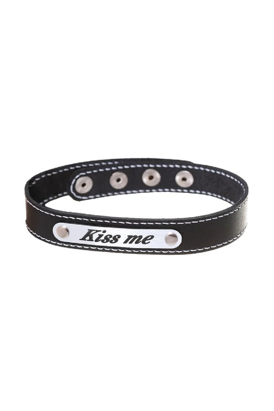 Такой чокер привлечет внимание не только любителей БДСМ ролевых игр, но и тех, кто хочет добавить в свой повседневный образ немнго дерзости. Натуральная кожа, изысканная скромность, удобство фиксации при помощи кнопок – у него есть все, чтобы стать одним из самых любимых акссесуаров в вашей спальне. Чокер изготовлен из натуральной кожи и дополнен вставкой под металл с надписью Kiss me. Регулируется при помощи кнопок.Размер: длина 41 см, ширина ремешка 2 см. Цвет черный.