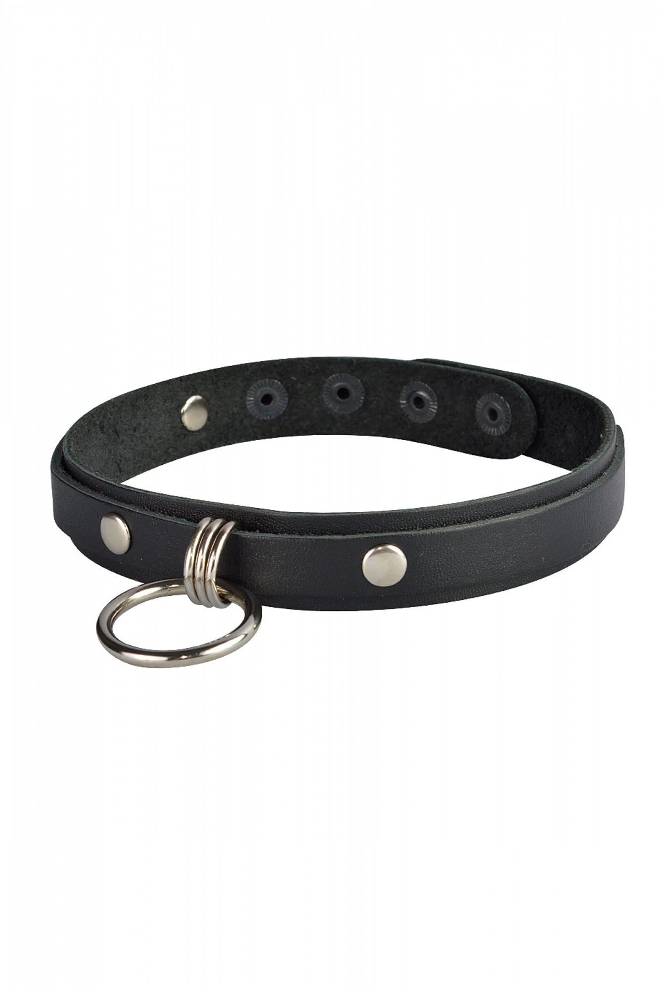 Стильный чокер изготовлен из натуральной кожи черного цвета и декорирован металлическим кольцом диаметром 3,3 см. Длина чокера 41 см, ширина - 2 см. Вся металлическая фурнитура имеет никелевое покрытие. Регулируется при помощи кнопок. Размер: универсальный. Цвет: черный.