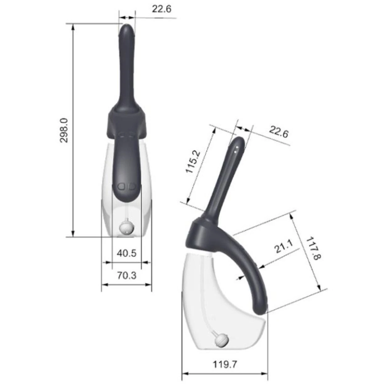 Душ для интимной гигиены, который представляет собой целую систему для подготовки к сексу. Колба вмещает в себя 450 мл воды, которая распыляется автоматически 3 разными режимами. Кроме того, силиконовая насадка на колбе имеет 3 режима глубокой вибрации, которая расслабит мышцы и сделает введение намного проще. Насадка сгибается и фиксируется в любом положении. Кнопки на ручке игрушки дублированы, поэтому включать и переключать режимы будет удобно из любого положения. Для включения необходимо нажать и удерживать в течении трех секунд кнопку, которая расположена на ручке. Для наполнения колбы необходимо использовать только очищенную воду, обычная вода из под крана может навредить микрофлоре кишечника и слизистой. Насадка выполнена из гипоаллергенного силикона премиум качества, он гарантированно обеспечит безопасные и приятные ощущения. Размер: длина 29,8 см, длина насадки 11,5 см, диаметр 2,2 см. Для более комфортного использования рекомендуем приобрести смазку на водной основе.