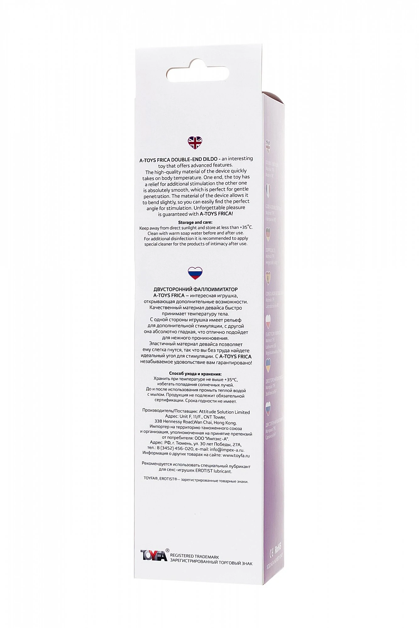 Двусторонний фаллоимитатор A-Toys Frica – интересная игрушка, открывающая дополнительные возможности. Качественный материал девайса быстро принимает температуру тела. С одной стороны игрушка имеет рельеф для дополнительной стимуляции, с другой она абсолютно гладкая, что отлично подойдет для нежного проникновения. Эластичный материал девайса позволяет ему слегка гнутся, так что вы без труда найдете идеальный угол для стимуляции. С A-Toys Frica незабываемое удовольствие вам гарантировано! Размер: длина 23 см, диаметр 2,4-3,1 см.Цвет фиолетовый. Для более комфортного использования рекомендуем приобрести смазку на водной основе и очищающий спрей Clear Toy 100 мл для обработки изделия.
