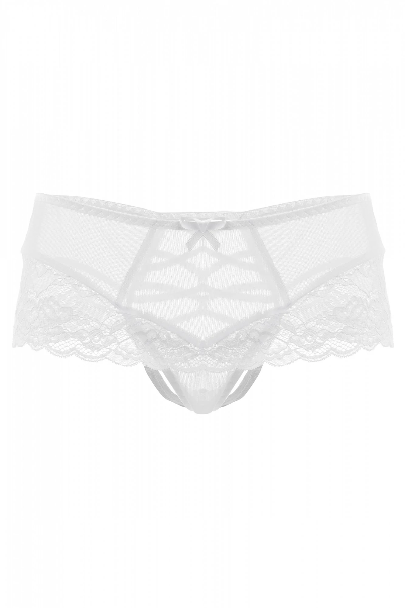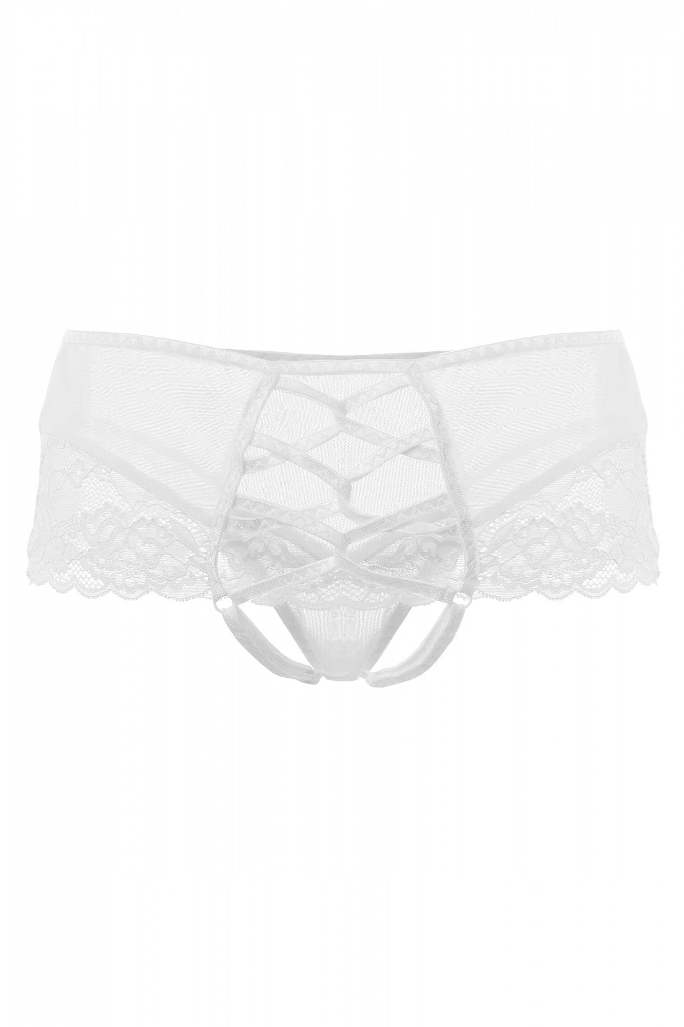 Яркое сочетание изысканного кружева и смелой шнуровки делает эротические трусики Cheryl от Erolanta незаменимым атрибутом интригующего образа. Эластичная сетка, дополненная вставками из нежного кружева, соблазнительно облегает бедра и расставляет на них аппетитные акценты. Эффектная шнуровка пробуждает смелые фантазии. Миниатюрные кольца и регуляторы на внутренних перемычках обеспечивают комфортную посадку. А дизайн доступа к интимной зоне позволяет наслаждаться игрой, не снимая при этом трусики. Почувствуйте себя по-настоящему желанной с трусиками Cheryl от Erolanta. Допускается замена кружева на аналогичное. Размер: 52-54. Цвет: белый.