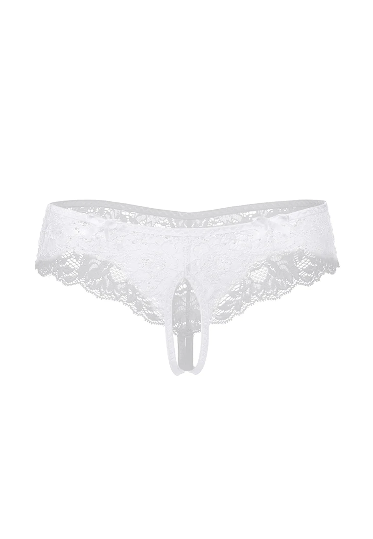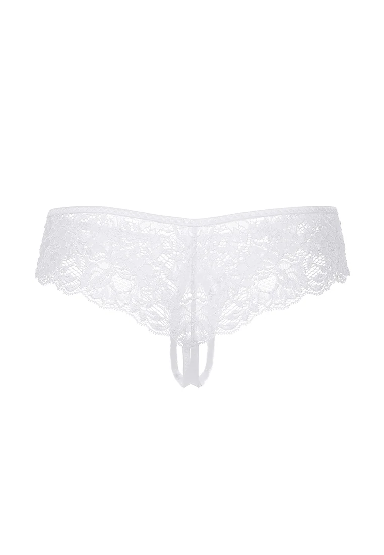 Эротические трусики кружевные, эластичные. Спереди декорированы атласными бантиками. Свободный кружевной край. Размер: 42-44. Цвет: белый. Товар без коробки.