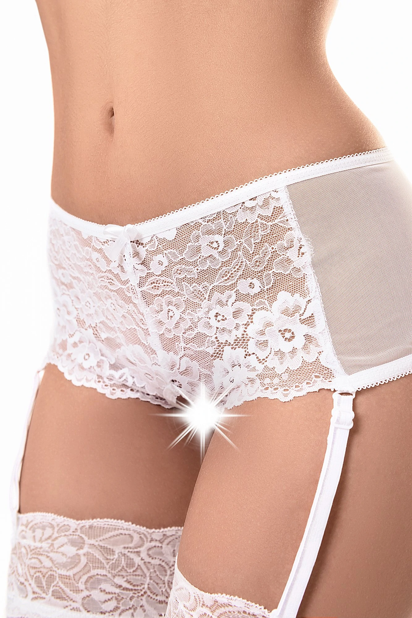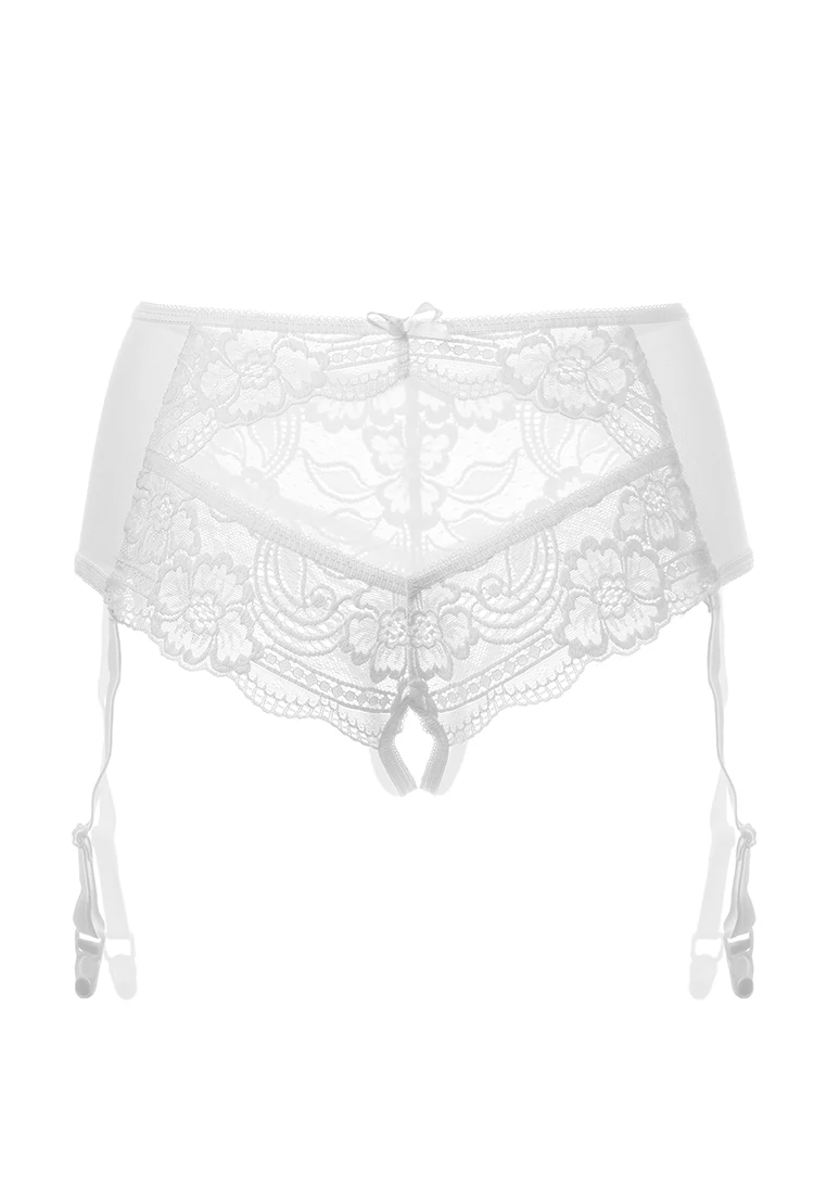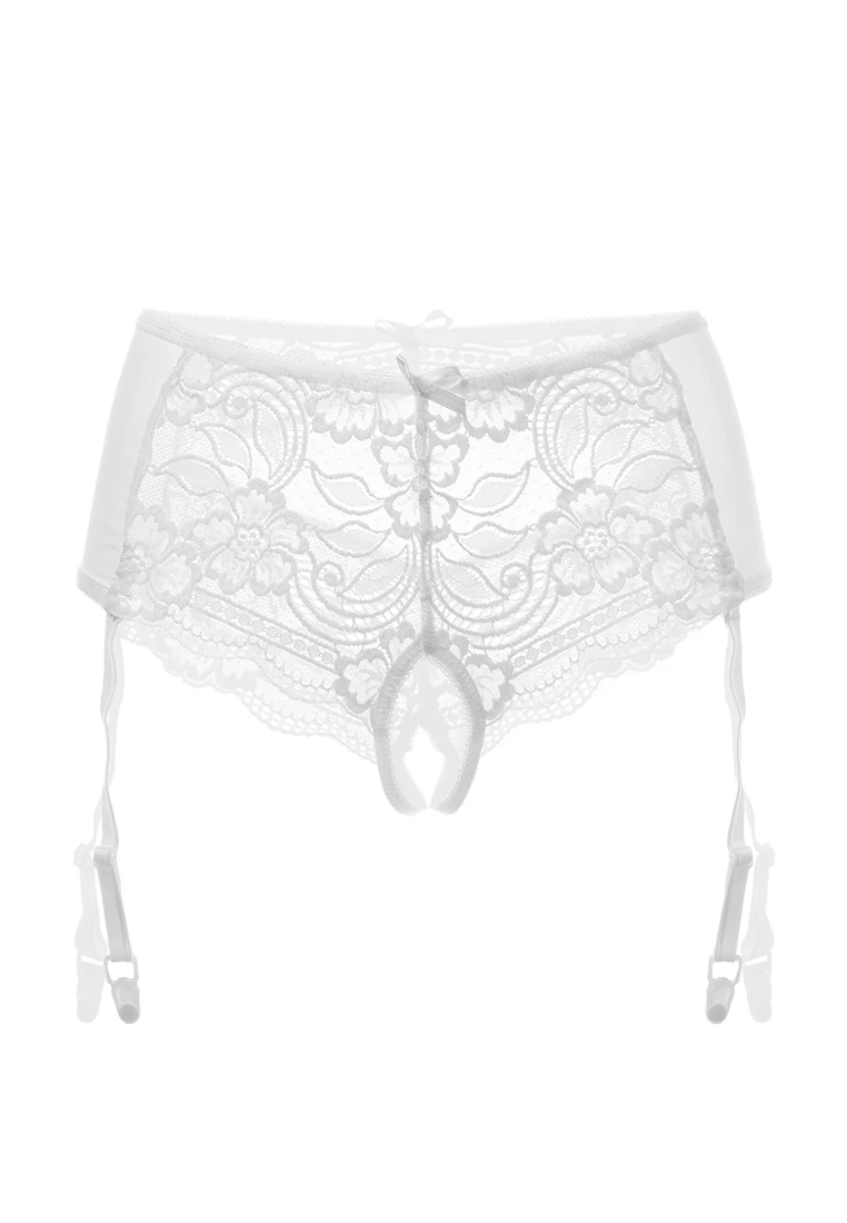 Эротические трусики-пояс Erolanta Sheila, эластичные, из стрейч-сетки со сложными кружевными вставками, с вырезом сзади, без боковых швов, с атласными бантиками. Съемные регулируемые пажи. Размер: 50-52. Цвет: белый. Товар без коробки.