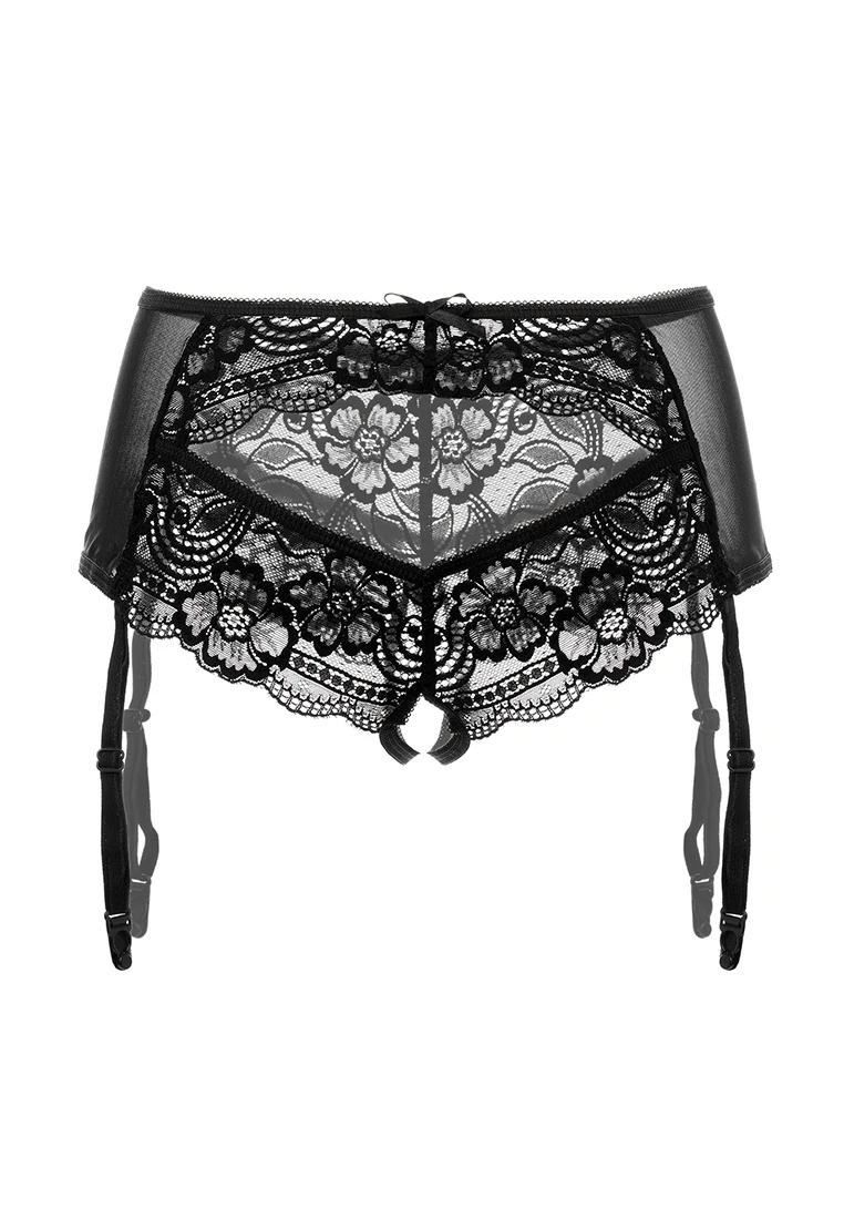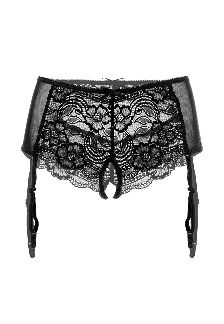 Эротические трусики-пояс из стрейч-сетки, эластичные, со сложными кружевными вставками, с вырезом сзади, без боковых швов, с атласными бантиками. Пажи съемные. Упаковка: коробка 14 х 10 х 2,5 см с еврослотом. Размер: 50-52.
