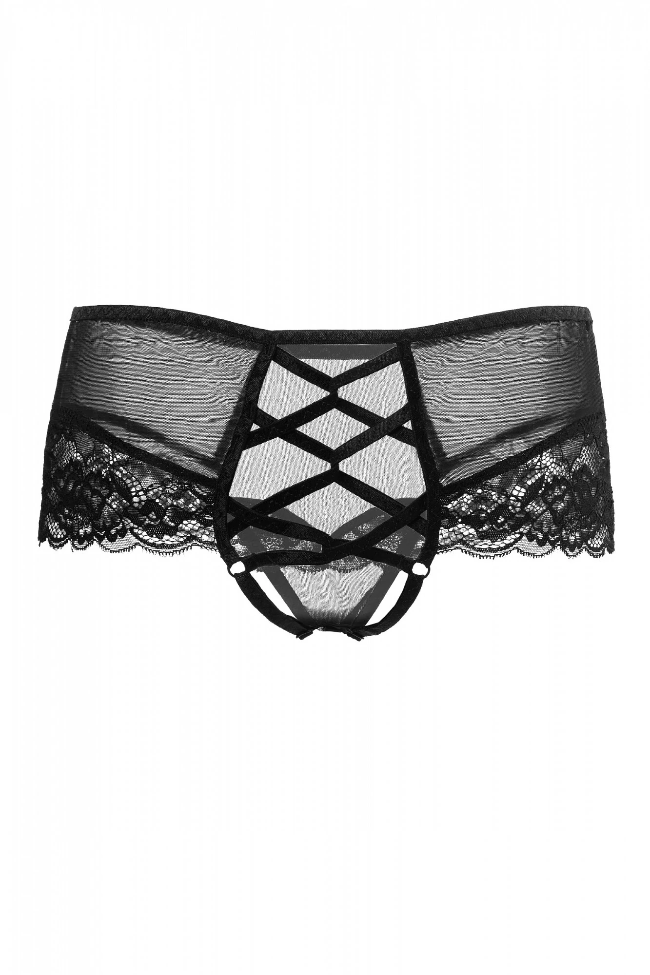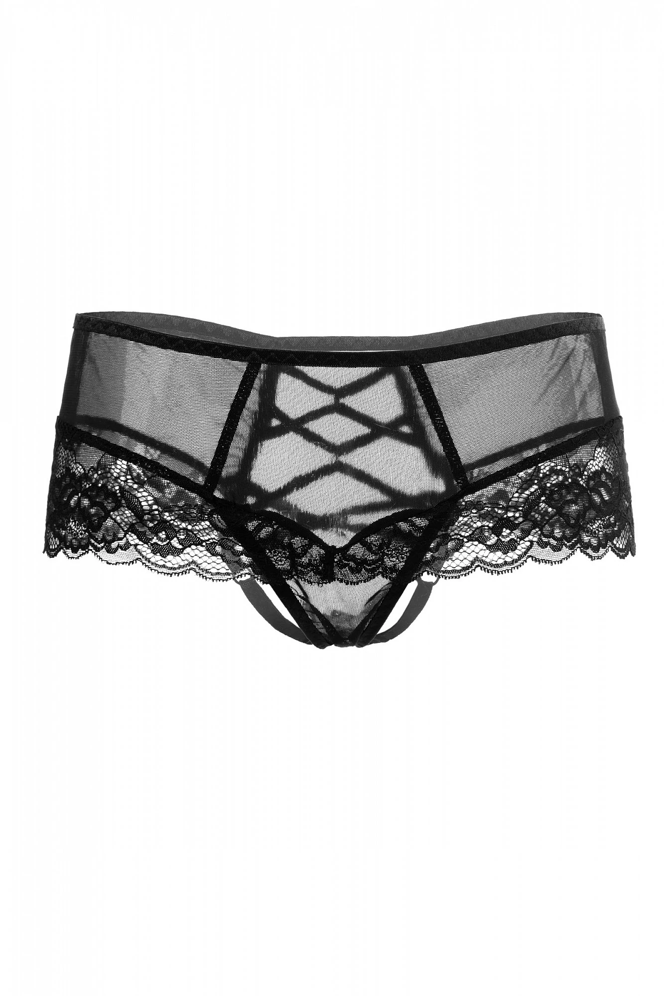 Яркое сочетание изысканного кружева и смелой шнуровки делает эротические трусики незаменимым атрибутом интригующего образа. Эластичная сетка, дополненная вставками из нежного кружева, соблазнительно облегает бедра и расставляет на них аппетитные акценты. Эффектная шнуровка пробуждает смелые фантазии. Миниатюрные кольца и регуляторы на внутренних перемычках обеспечивают комфортную посадку. А дизайн доступа к интимной зоне позволяет наслаждаться игрой, не снимая при этом трусики. Допускается замена кружева на аналогичное. Размер: 50-52. Цвет: черный.