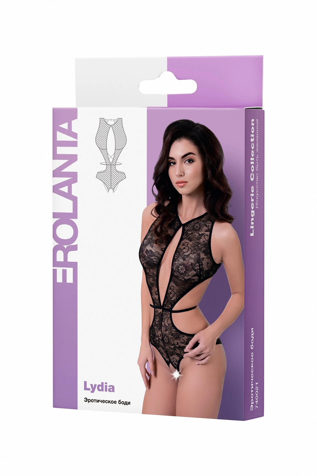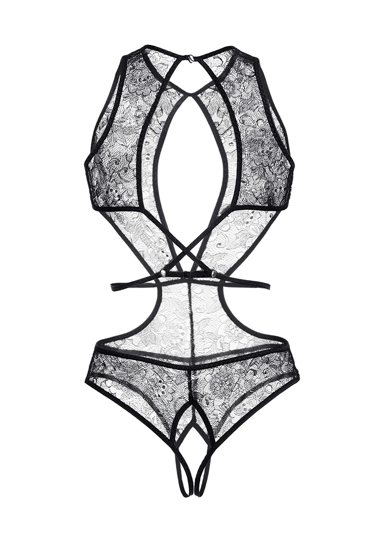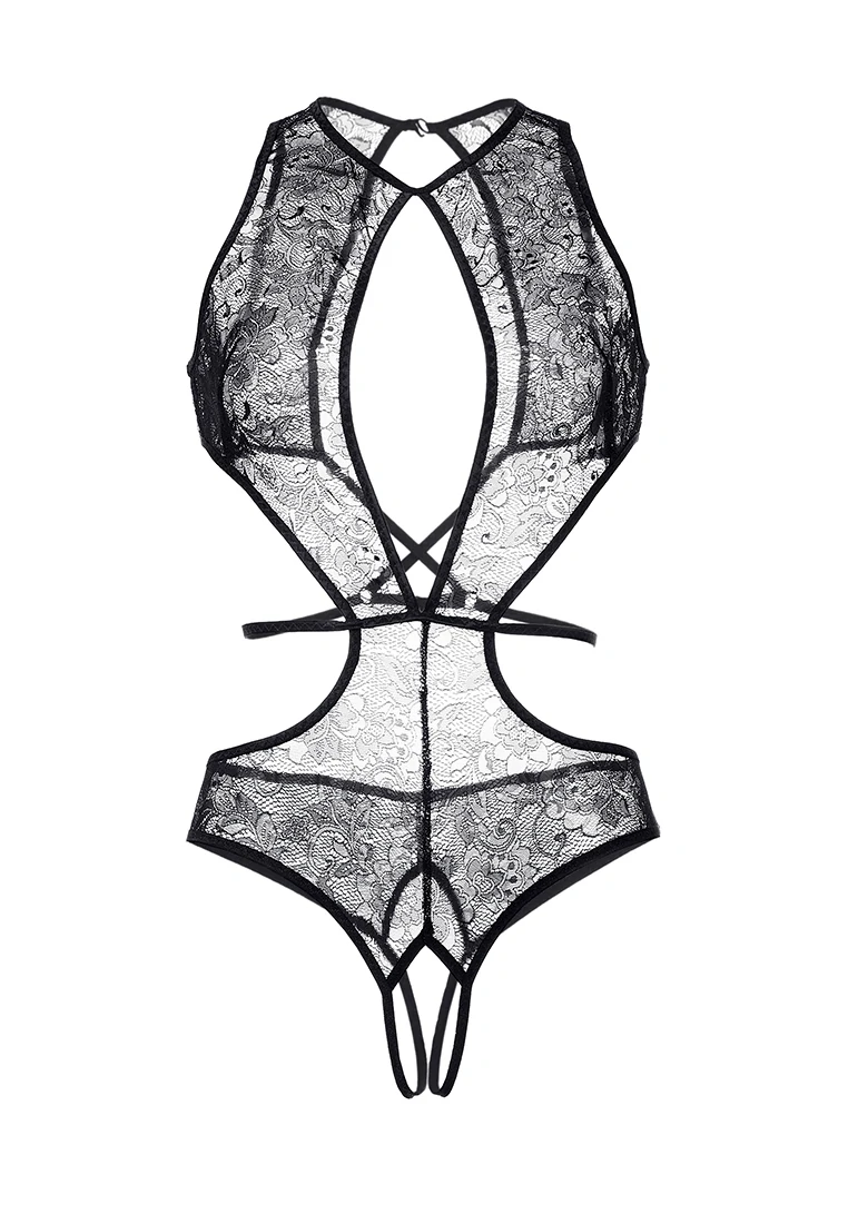 Эротическое боди из плотного кружевного полотна, с фигурным декольте. Застежка на шее. Открытая спинка. Перекрещивающиеся бретели соединены с регулируемым поясом. Допускается замена кружева на аналогичное. Размер: 46-48. Ростовка изделия 162-164 см. Цвет: черный.