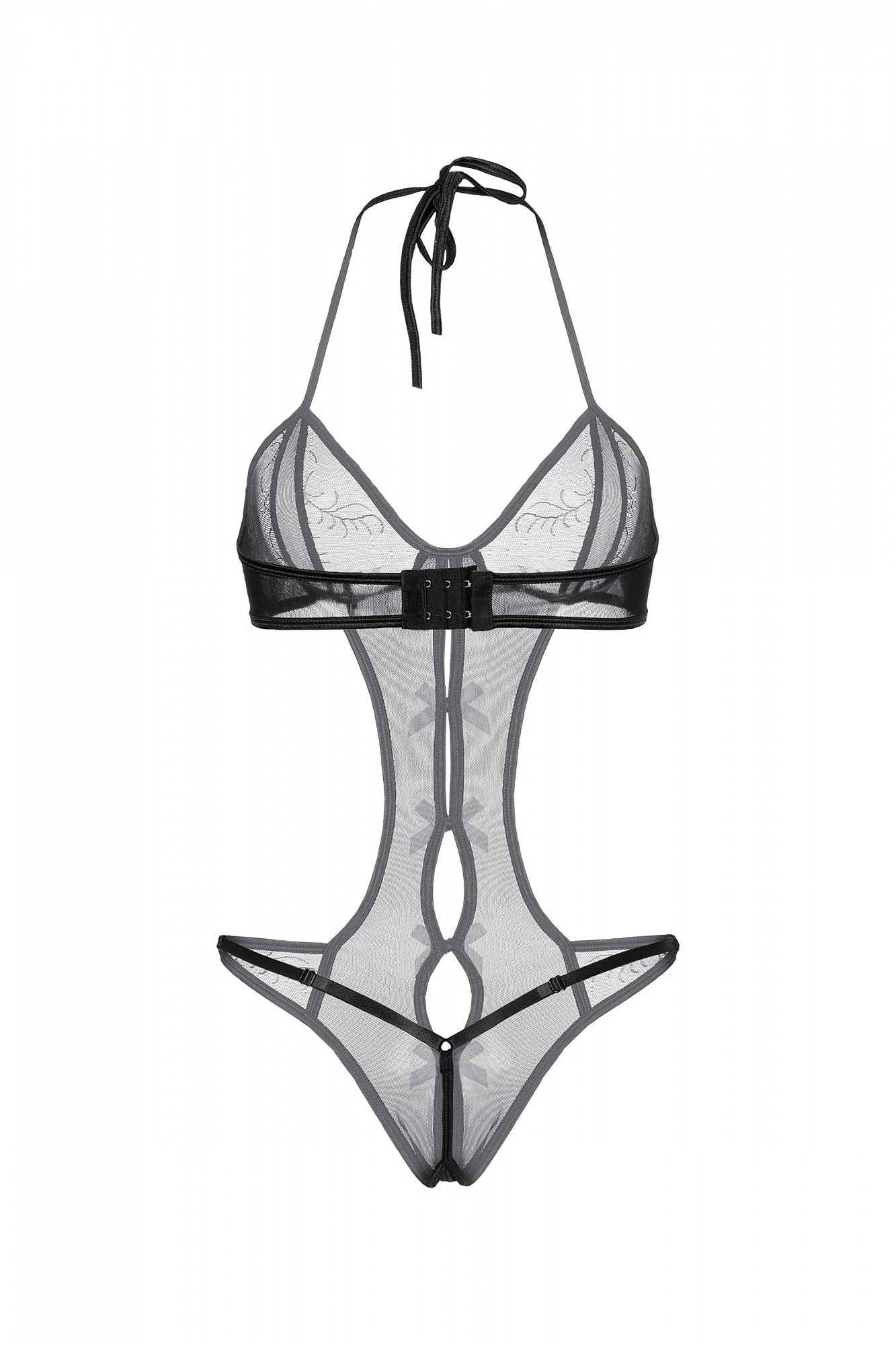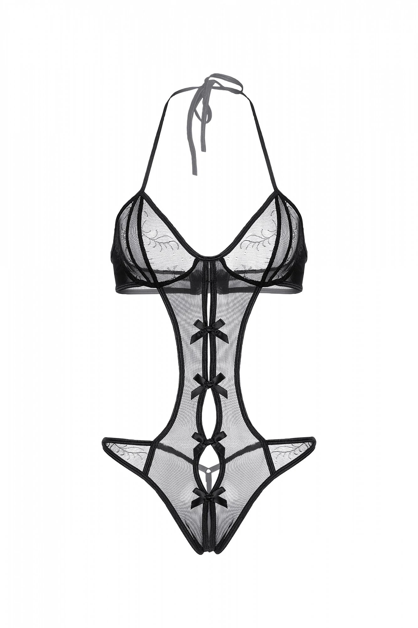 Мягкое боди-монокини из эластичной сетки. Продольный фигурный вырез дополнен сатиновыми бантиками. Завязки на шее, тройная застежка ''крюк-петля'' сзади. Регулируемые боковые перемычки. Размер: универсальный. Цвет: черный.