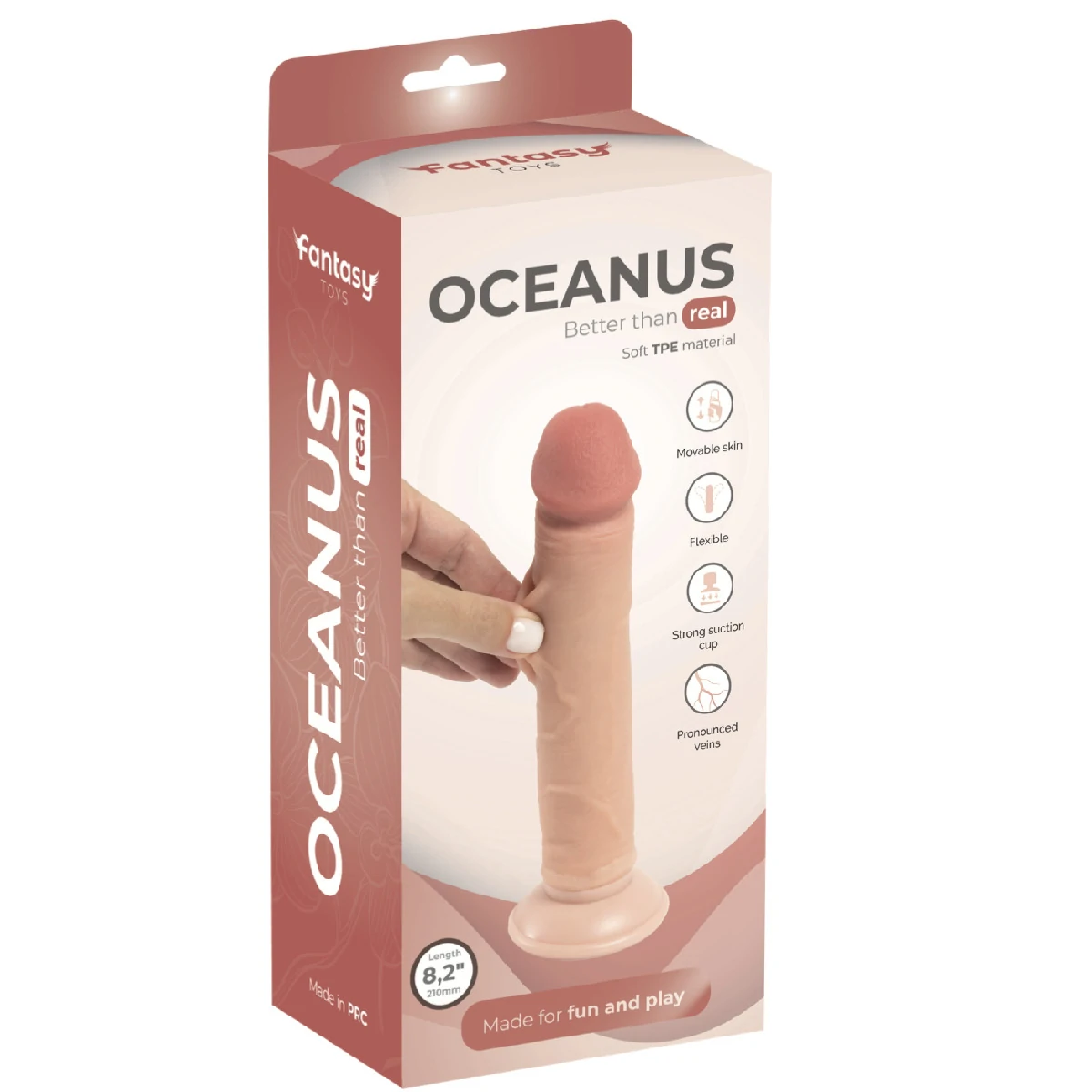 Представляем Oceanus от бренда Fantasy Toys – идеальный спутник в ваших интимных приключениях. Двухслойный ультрареалистичный фаллоимитатор с подвижной кожей. Его реалистичные пропорции, рельефные вены и нежная головка сразу погружают в атмосферу настоящего удовольствия. Выделяющаяся головка отлично качественно простимулирует самые требовательные эрогенные зоны. Уверены, что ваша зона G будет в восторге от знакомства с Oceanus. Изготовлен из качественного материала TPE. Прочная, эластичная присоска позволяет зафиксировать игрушку на любой гладкой поверхности. Размер: длина 21 см, рабочая длина 18,5 см, диаметр 3,8 см. Цвет телесный. Для более комфортного использования рекомендуем приобрести смазку на водной основе и очищающий спрей Clear Toy 100 мл для обработки изделия.