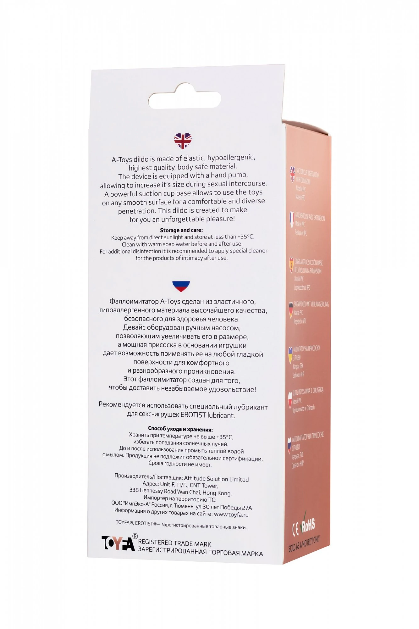 Фаллоимитатор A-Toys сделан из эластичного, гипоаллергенного материала высочайшего качества, безопасного для здоровья человека. Девайс оборудован ручным насосом, позволяющим увеличивать его в размере. А мощная присоска в основании игрушки дает возможность применять ее на любой гладкой поверхности для комфортного и разнообразного проникновения. Этот фаллоимитатор создан для того, чтобы доставить незабываемое удовольствие! Размер: общая длина 19,5 см, рабочая длина 16 см, диаметр увеличивается. Для более комфортного использования рекомендуем приобрести смазку на водной основе и очищающий спрей Clear Toy 100 мл для обработки изделия.