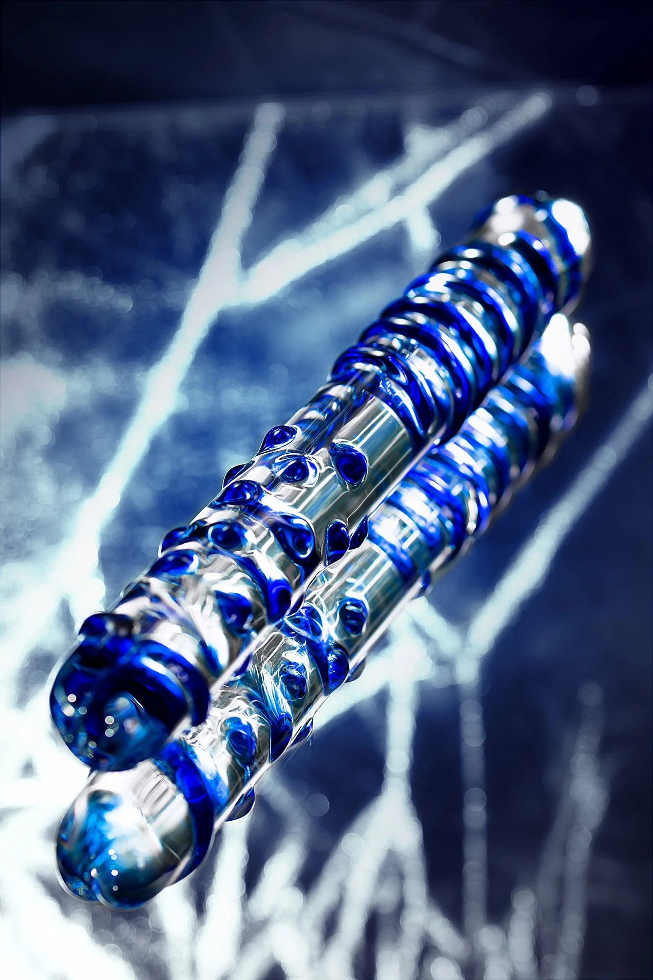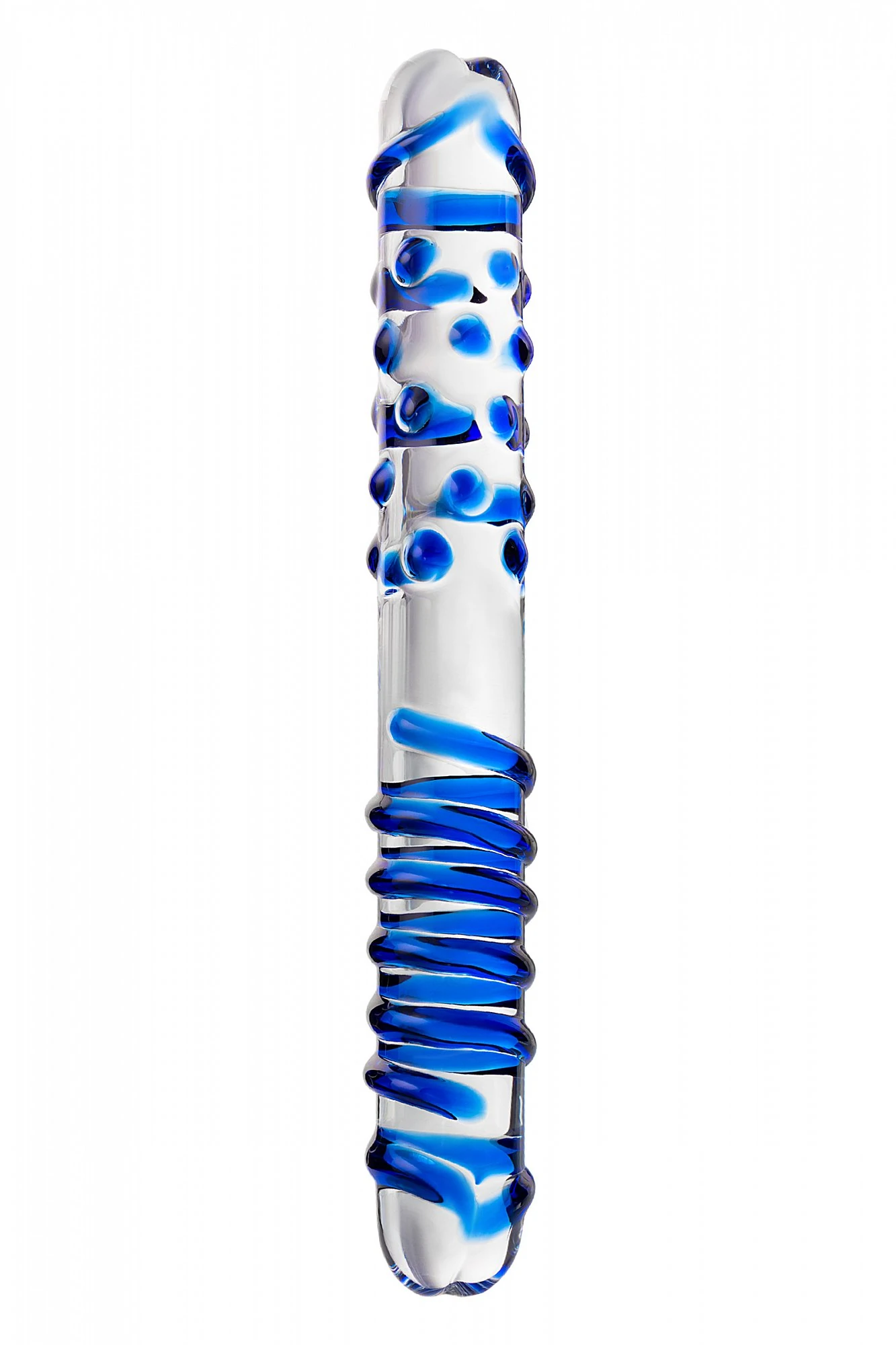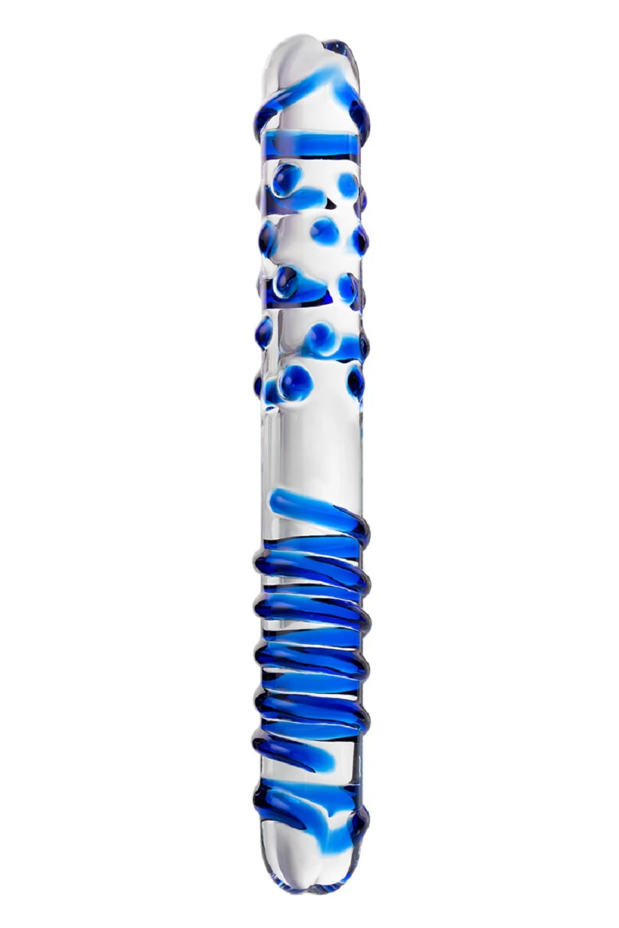 Двусторонний прямой жезл-стимулятор с объемными массажными точками на одной половине и рельефной спиралью - на другой может служить и как стимулятор ануса и как вагинальный массажер. Стимулятор ручной работы из прозрачного закаленного стекла, которое является абсолютно гипоаллергенным и безопасным. Массажные точки и спираль выполнены синим цветом.