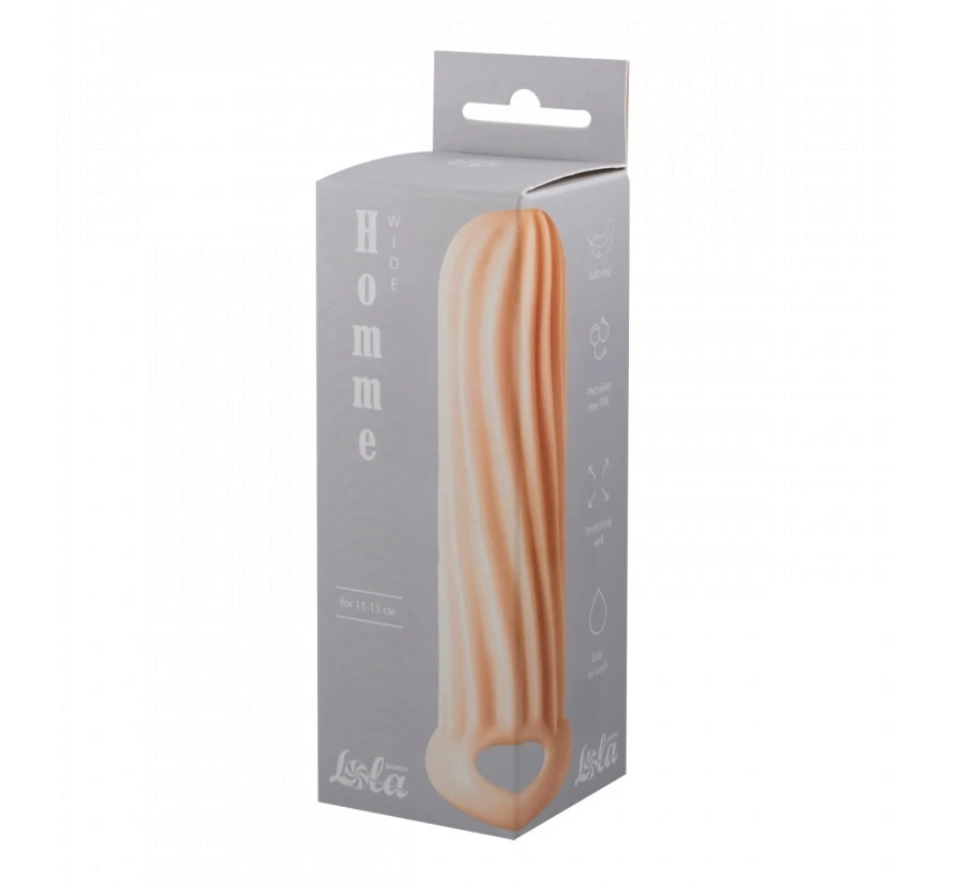 Насадка Wide коллекции Homme обеспечивает увеличение размера пениса в ширину. Материал насадки - гипоаллергенный, создающий имитацию мягкой и шелковистой кожи ТПЕ. Фиксирующее кольцо на мошонку не только удерживает фаллоудлинитель, но и благодаря сдавливанию может усиливать эрекцию. Двухсторонний нереалистичный рельеф насадки позволит одновременно стимулировать сразу обоих партнеров во время полового акта и дополнительно подарит приятные ощущения. Благодаря толстым стенкам, насадка увеличивает диаметр пениса до 1,5 см. Насадка отлично тянется, продлевает время интимной близости и компенсирует анатомическое несоответствие между партнерами Материал ТПЕ. Размер: длина 13 см, длина внутреннего тоннеля 12,5 см, внешний диаметр 3,8 см, толщина стенки 7 мм. Цвет бежевый. Для более комфортного использования рекомендуем смазку на водной основе и очищающий спрей Clear Toy 100 мл.