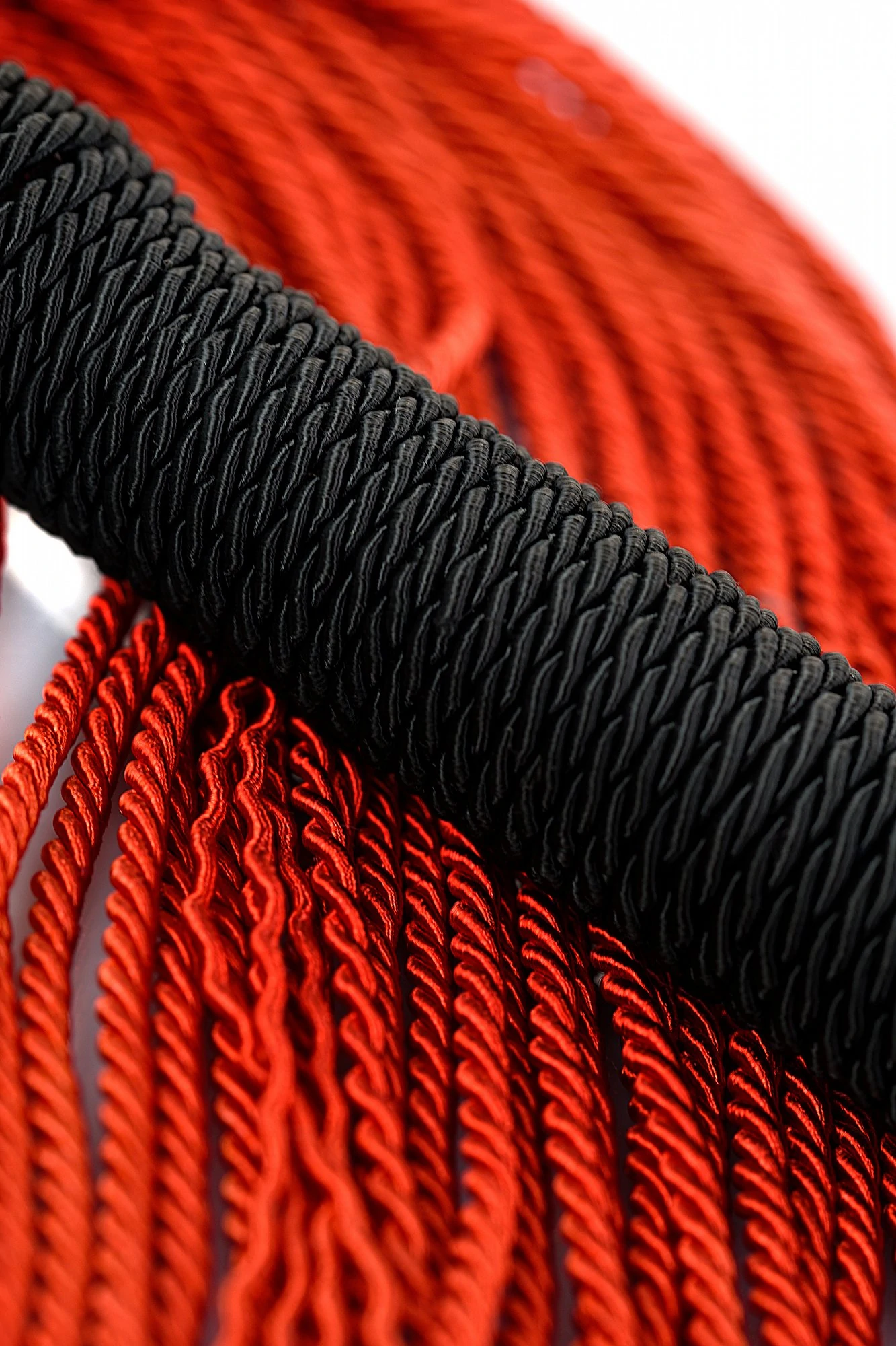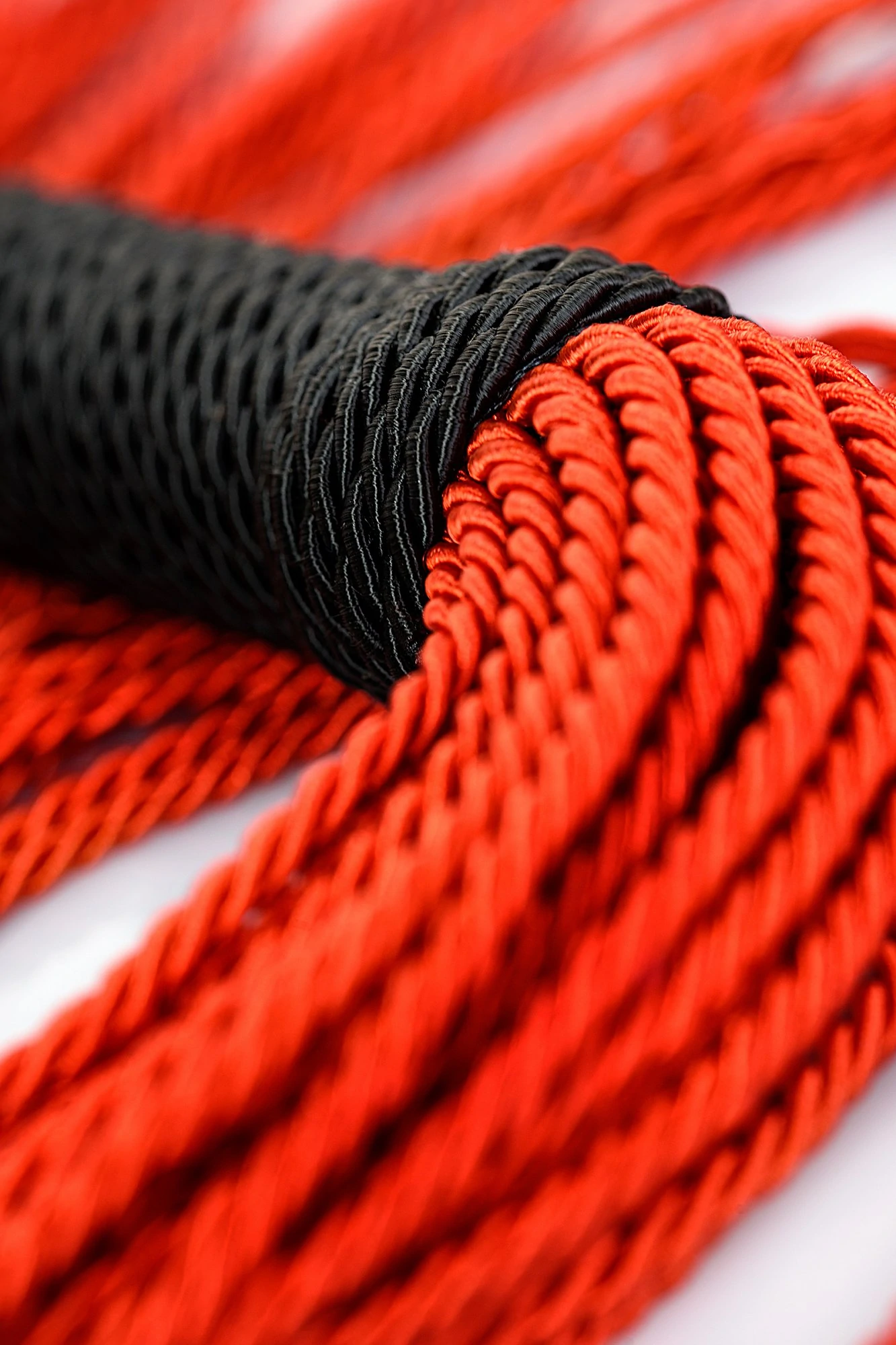 Самый безопасны для нежной попки.Веревочный флоггер с красными хвостами и черной плетеной ручкой мягко разогревает кожу и готовит к более серьезным воздействиям.