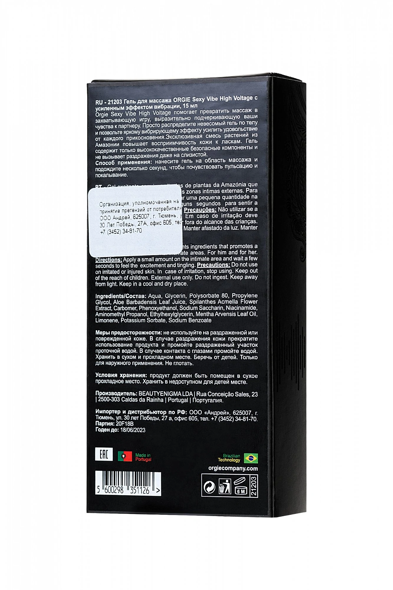Orgie Sexy Vibe High Voltage помогает превратить массаж в захватывающую игру, выразительно подчеркивающую ваши чувства к партнеру. Просто распределите невесомый гель по телу и позвольте яркому вибрирующему эффекту усилить удовольствие от каждого прикосновения. Эксклюзивная смесь растений из Амазонии повышает восприимчивость кожи к ласкам. Гель содержит только высококачественные безопасные компоненты и не вызывает раздражения даже на слизистой. Способ применения: нанесите гель на область массажа и подождите несколько секунд, чтобы почувствовать пульсацию и покалывание. Объем: 15 мл.