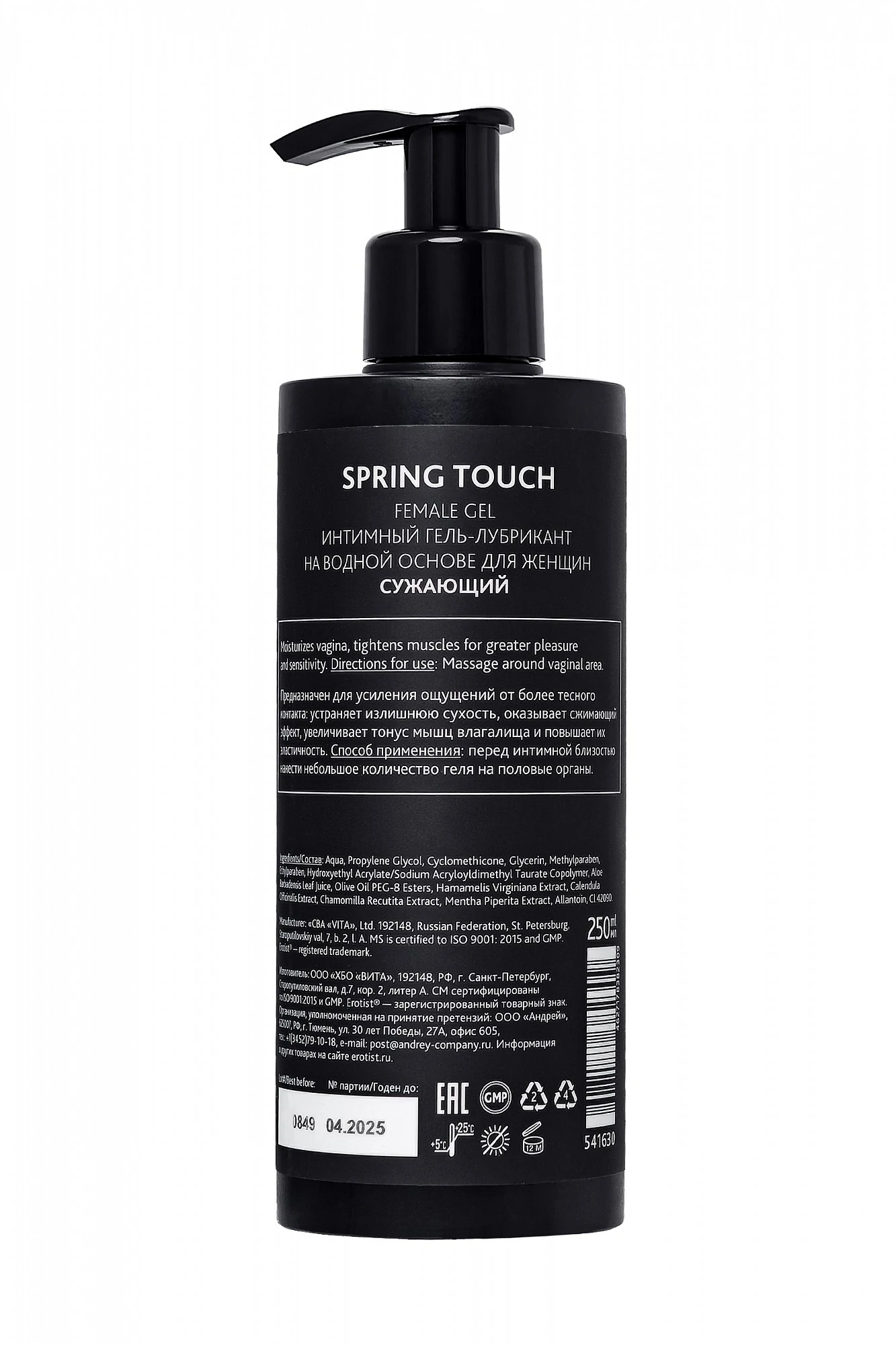 Как почувствовать весеннее прикосновение в любое время года? С помощью геля для женщин Erotist Spring Touch на водной основе. Этот гель создан, чтобы каждый день близость с партнёром радовала нежностью, похожей на поцелуй весны. Натуральные компоненты деликатно подчёркивают естественный аромат тела. Концентрация геля дарит шелковистое скольжение. Но самое главное — Erotist Spring Touch обладает сжимающим эффектом, который увеличивает тонус мышц влагалища. Тесный контакт, усиливающий степень эйфории, гарантирован! Объем: 250 мл.