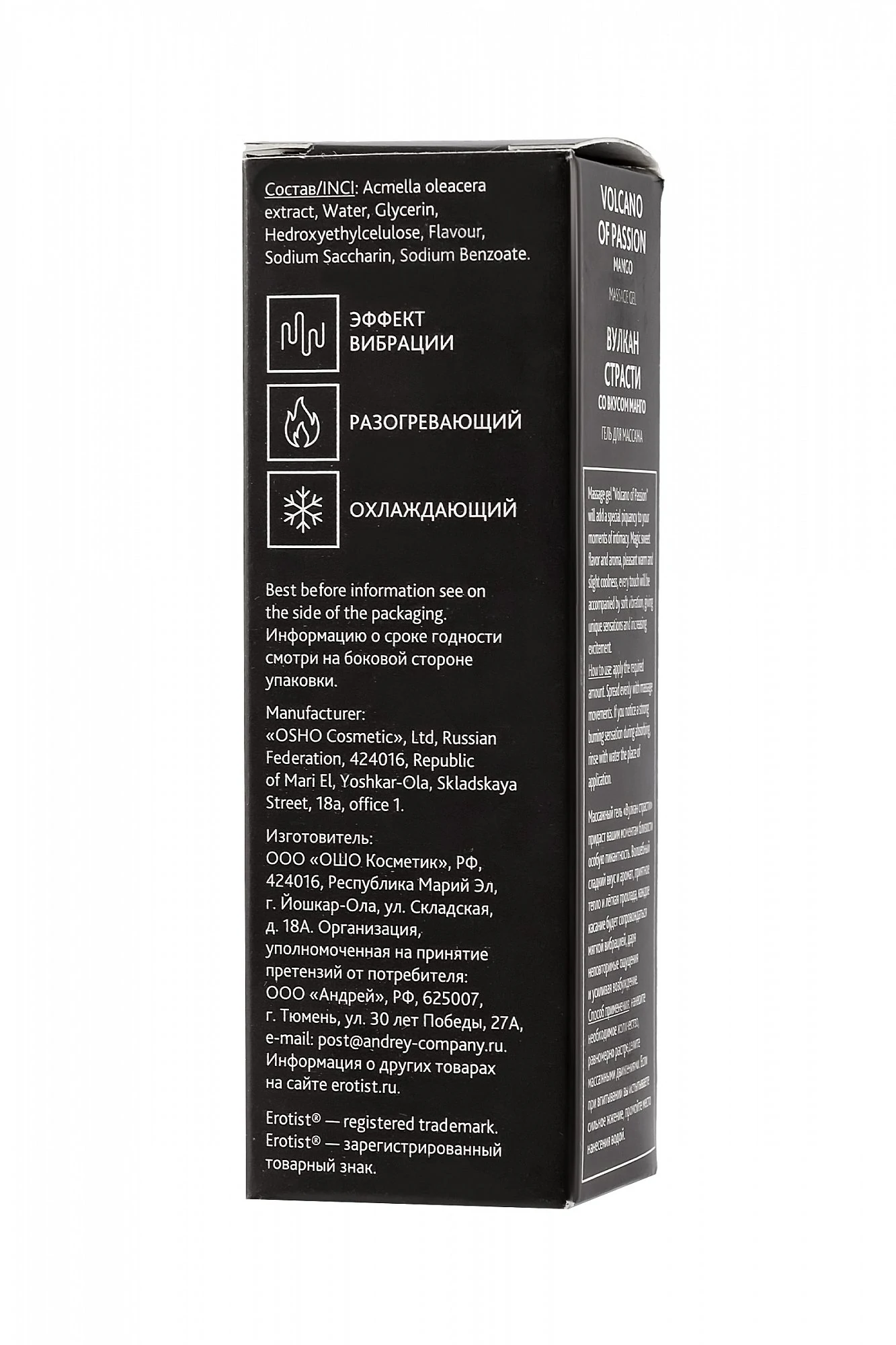 Массажный гель «Вулкан страсти» придаст вашим моментам близости особую пикантность. Волшебный сладкий вкус и аромат, приятное тепло и лёгкая прохлада, каждое касание будет сопровождаться мягкой вибрацией, даря неповторимые ощущения и усиливая возбуждение. Нанесите немного жидкого геля на интимные зоны, и через несколько секунд вы почувствуете тепло, затем в течение 2-3 минут легкую вибрацию и легкий холодок. Длительность эффекта зависит от особенностей вашего организма. Гель с вибрирующим эффектом для интимных зон на основе натуральных ингредиентов, без парабенов. Вкус и аромат манго. Подходит для поцелуев и орального секса. Способ применения: нанесите небольшое количество геля на кончики пальцев и коснитесь клитора и вагинальных губ, массируя. Для наружного применения.