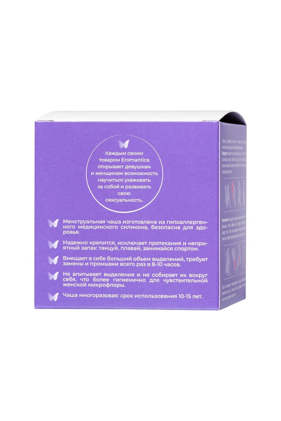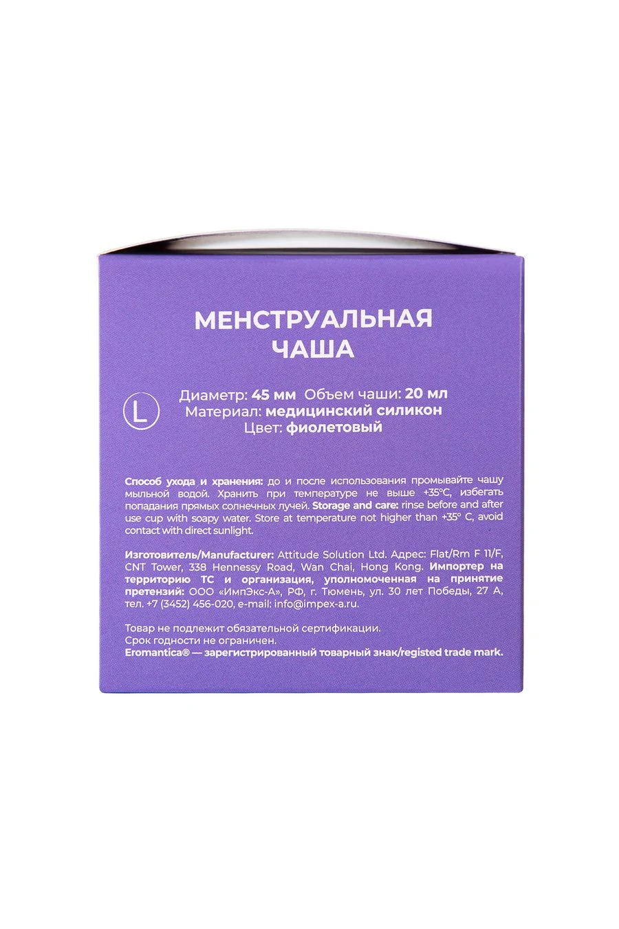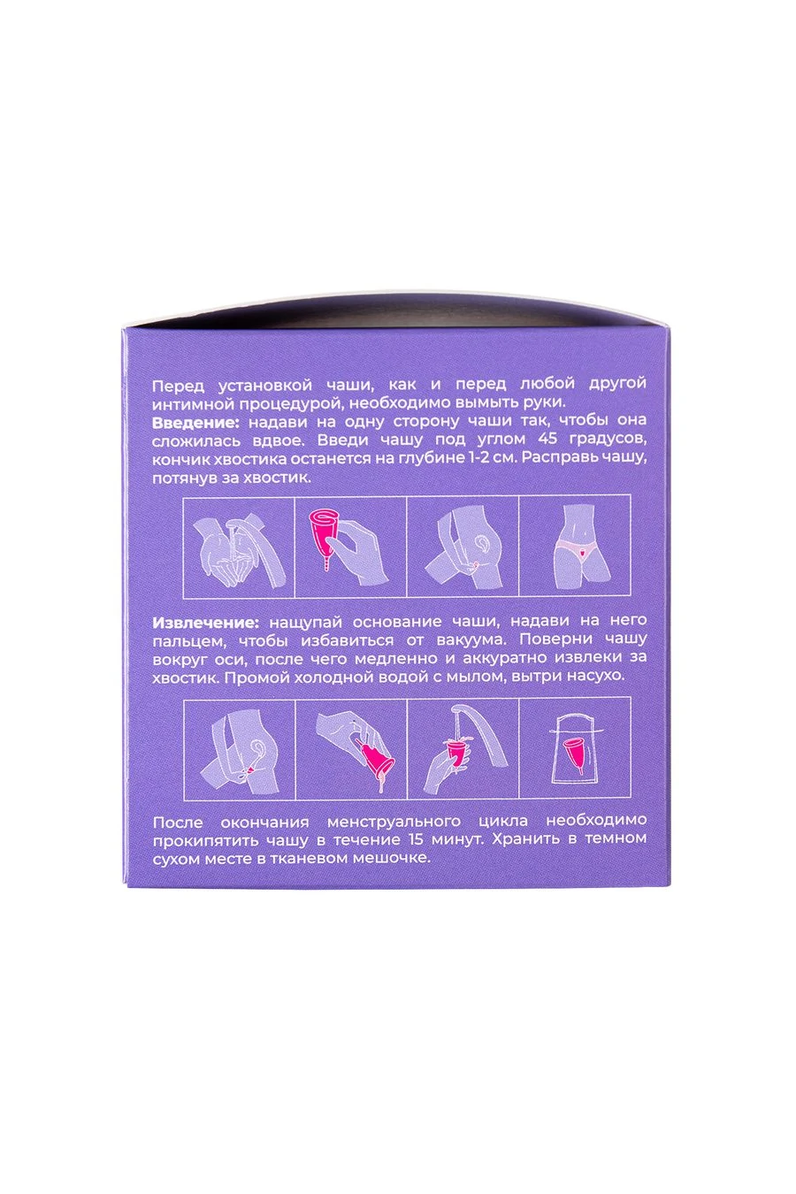 Изготовлена из высококачественного медицинского силикона. Удобна и безопасна в применении. В отличие от прокладок и тампонов, которые, как уже доказано, отрицательно влияют на женское интимное здоровье, менструальная чаша абсолютно безопасна и удобна в применении. К тому же, ее можно использовать не один раз, что очень удобно и практично. Но самое главное – с менструальной чашей ты можешь забыть о таких неприятных моментах, как протекание и неприятный запах. С менструальной чашей эти дни пройдут гораздо комфортнее, чем ты можешь себе представить. Цвет: фиолетовый. Диаметр - 45 мм Объем - 20 мл.