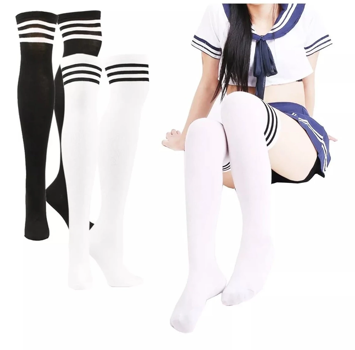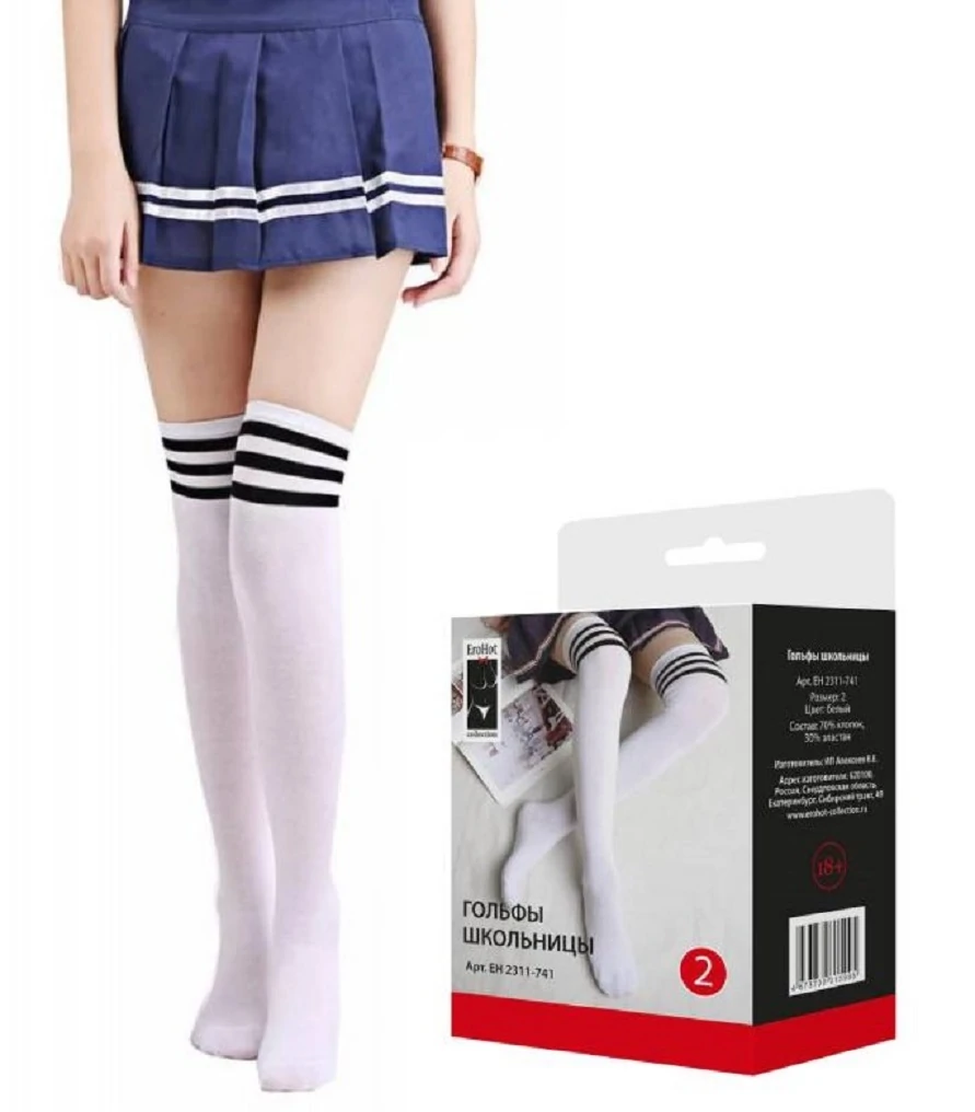 Белые гольфы с чёрными полосками помогут создать невинный образ и станут завершающим штрихом в образе школьницы или озорной студентки. Длина 45 см. Состав: 70% хлопок, 30% эластан. Цвет: белый. Размер: 2(S).