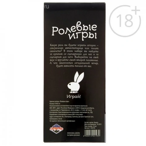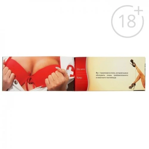 Горячие игры! Какую роль вы будете играть этим вечером? Горячей медсестры или сексапильного пилота самолёта? Выбирайте сценарий вечера и дарите незабываемые ласки второй половинке! Преображайтесь и наслаждайтесь! Внутри вы найдёте купоны со страстными сценариями для неё и для него. Выбирайте любой понравившийся план событий и дарите друг другу страстное наслаждение! В набор входят: 20 купонов. Сделайте вашу ночь по-настоящему страстной!