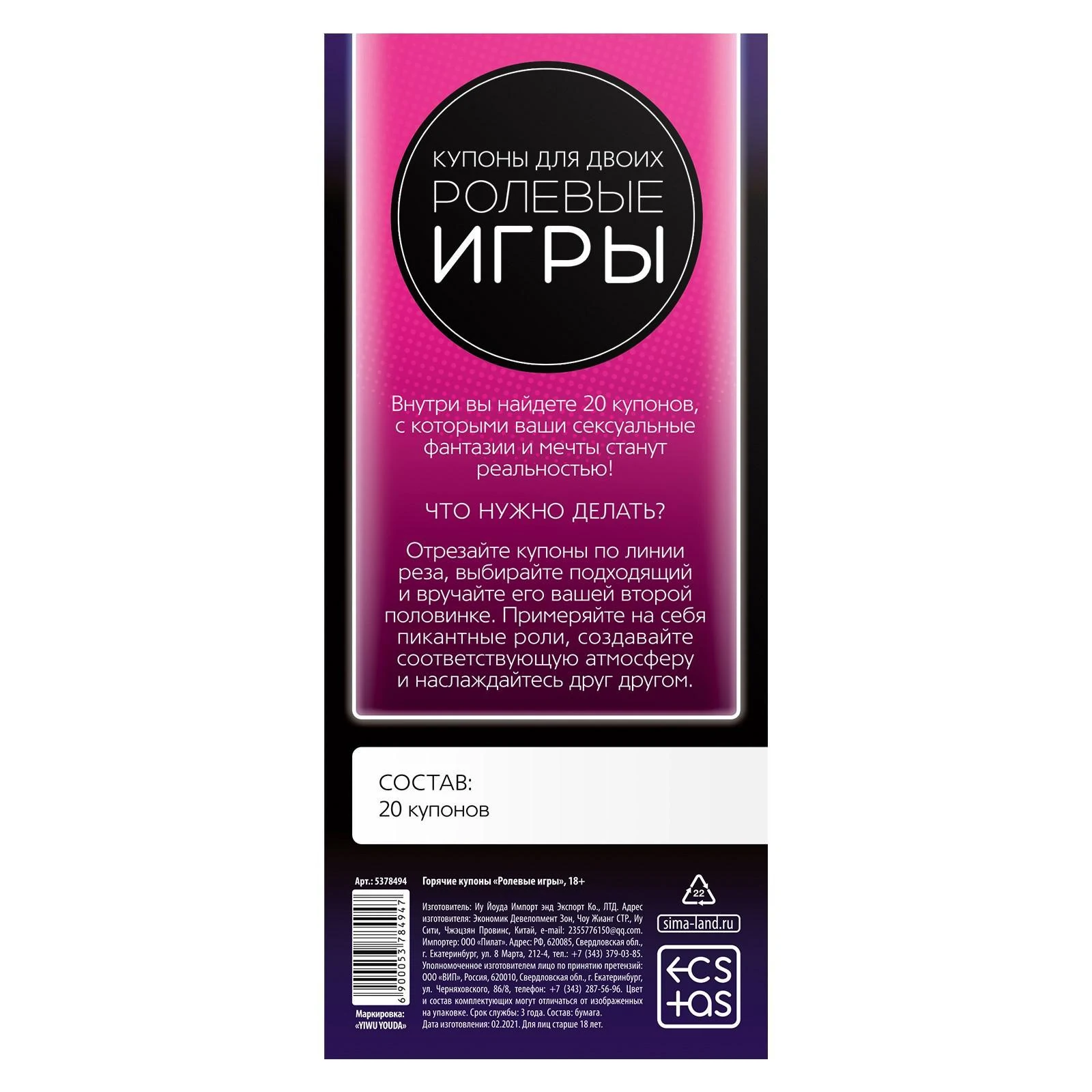С этими купонами ваши сексуальные фантазии и мечты станут реальностью! Примерьте на себя невероятно пикантные роли и насладитесь друг другом. Просто листайте страницы, выбирайте понравившуюся ролевую игру и воплощайте её в жизнь. А если добавить соответствующий реквизит и музыку, атмосфера станет ещё горячее! Подарите друг другу неземное удовольствие! В набор входят: 20 купонов. Теперь ваши сексуальные мечты сбудутся!