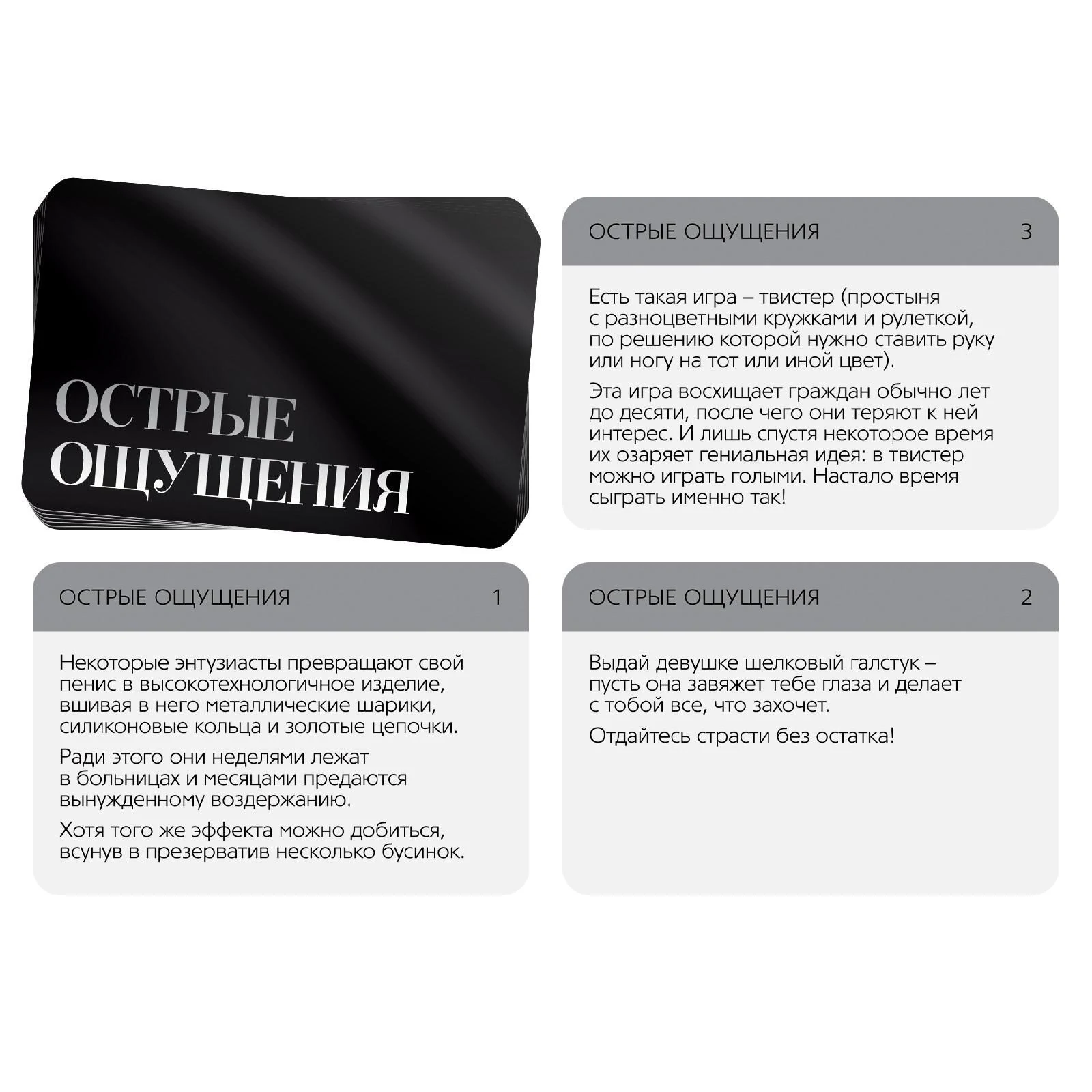 Эротическая игра для двоих. Добавьте перчинки в ваши отношения — поверьте, вы и ваша вторая половинка не разочаруетесь. Тяните карту, выполняйте указанное на ней задание и окунайтесь в мир острых ощущений, ярких эмоций и головокружительных чувств!