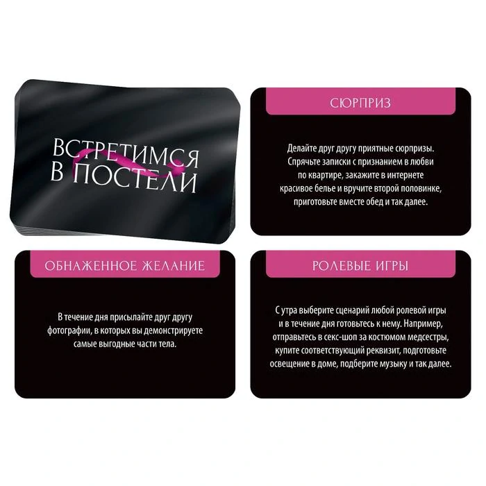 В этой коробке вас ждёт 20 способов возбудить друг друга в течение дня, чтобы вечером оказаться на вершине наслаждения. Для начала изучите задания и выберите те, которые будете использовать сегодня. Вытягивайте карточки, зачитывайте возбуждающие задания и выполняйте их! Внутри вы найдёте 20 карточек