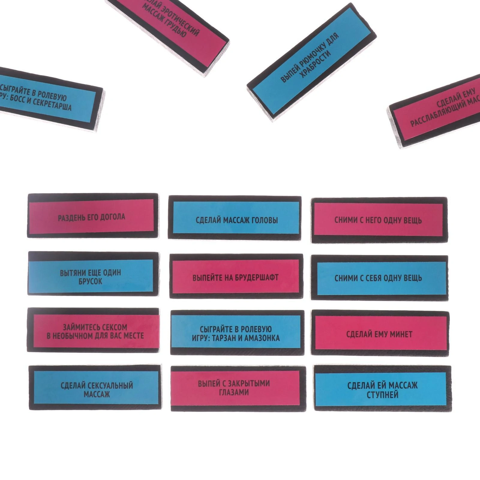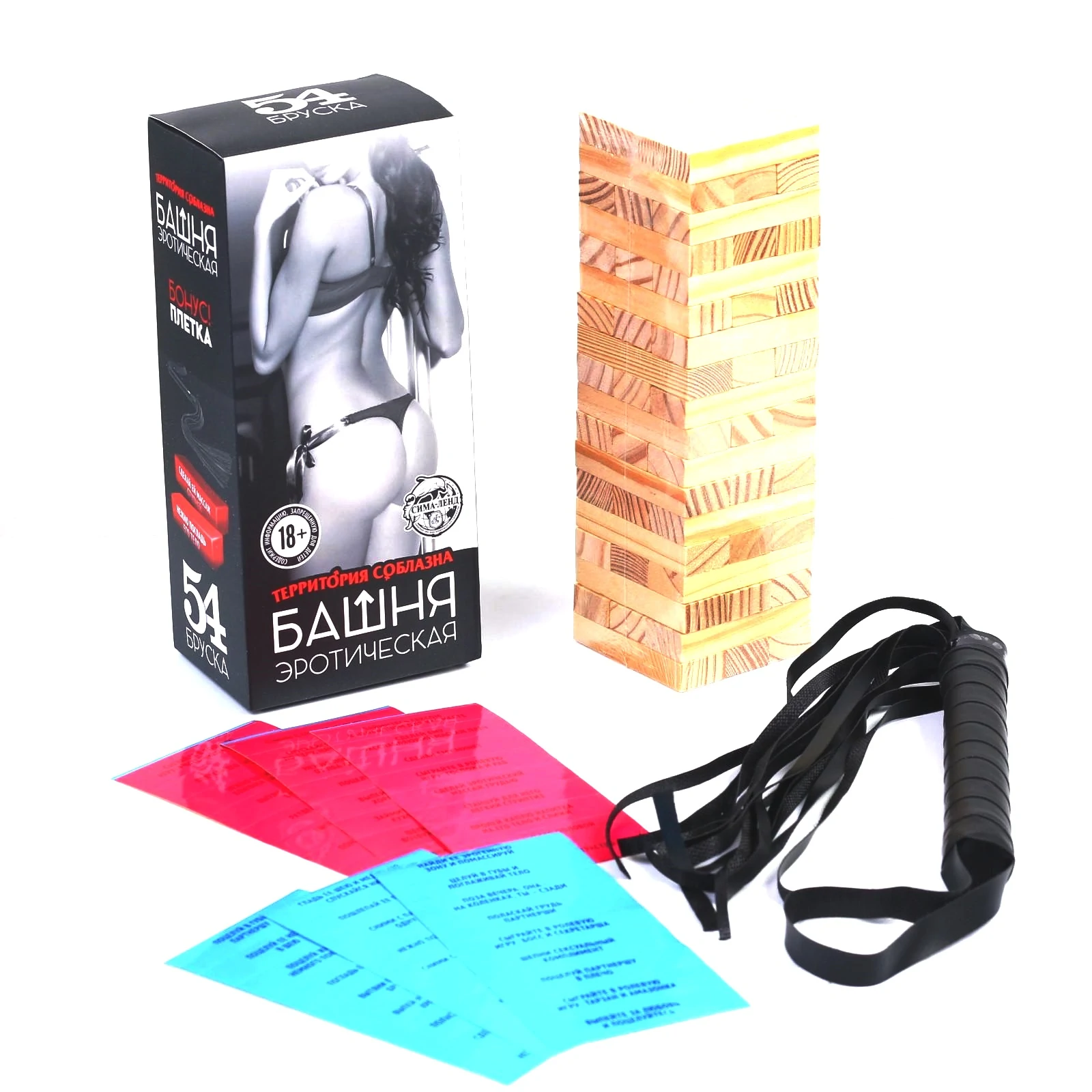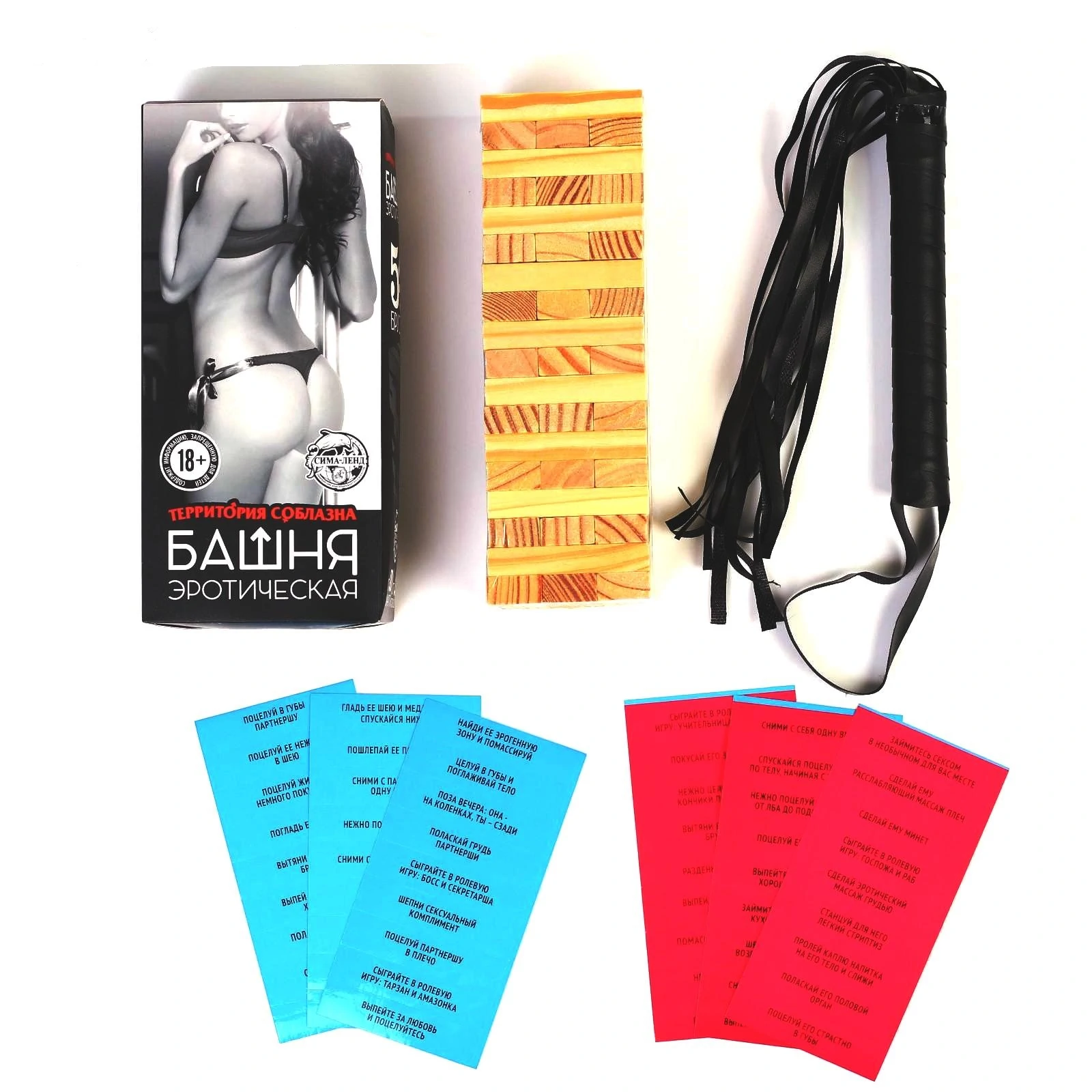 Хотите провести время вдвоем, да еще так, чтобы вечер прошел незабываемо и запомнился надолго? Попробуйте поиграть в Эротическую башню! В вашем распоряжении 54 деревянных брусков, которые необходимо выкладывать по три перпендикулярно друг другу. Что в итоге получилось? Верно, башня! Ну а теперь, самое интересное. Мужчина вытягивает из башни только голубые бруски, ну а дама – только красные. Зачитывайте задание с вытащенного бруска и выполняйте его. Страстные поцелуи, нежные поглаживания и даже ролевые игры. Ну а плетка, станет отличным дополнением к вашим играм. Состав игры: