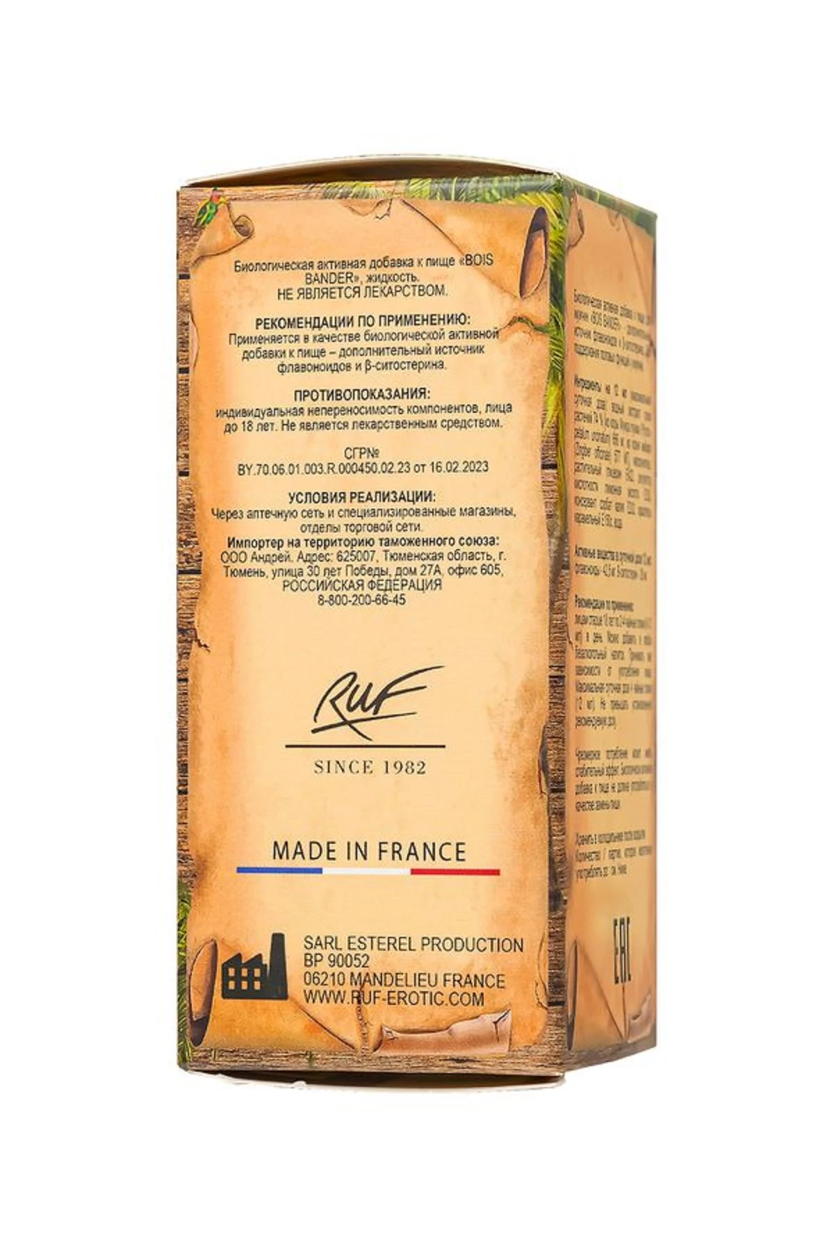 Сексуальный стимулятор Bois Bander для мужчин от RUF – это инновационный препарат для яркой сексуальной жизни. Эффективная диетическая добавка из Франции создана на основе высококачественного экстракта бразильской муира-пуамы и имбиря. Специально созданная формула помогает повысить либидо и обеспечивает прочную эрекцию, поддерживая нормальную сексуальную функцию. Йохимбин в составе активно способствует улучшению кровотока, обеспечивая уверенность и удовлетворение во время полового акта. Bois Bander предназначен для тех, кто стремится поддерживать нормальную сексуальную функцию, повышать либидо и обеспечивать стабильную эрекцию. Рекомендации по применению: Взрослым мужчинам по 2-4 чайные ложки (6-12 мл) в день вне зависимости от приема пищи. Можно добавить в любой безалкогольный напиток. Максимальная суточная доза 4 чайные ложки (12 мл). Не превышать установленную рекомендуемую дозу. Чрезмерное потребление может иметь слабительный эффект. Объем: 100мл.