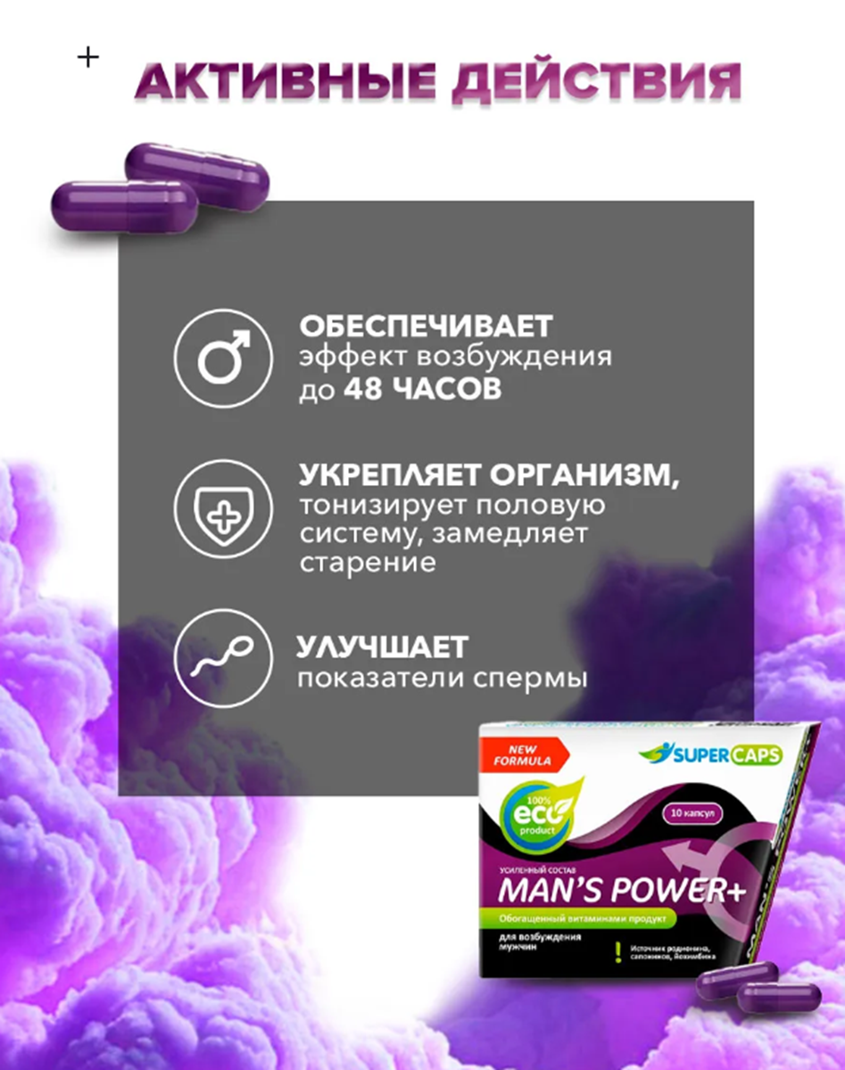 Преимущества: состав разработан российскими учеными с использованием инновационной технологии по гранулированию активных веществ первый на рынке продукт, который помимо возбуждения, положительно влияет на качество семенной жидкости и активности мужского организма в целом. В составе витамин плодовитости Е, аминокислоты ( L аргинин, L карнитин). отсутствие выраженных побочных эффектов (повышенное давление, головная боль) основной компонент - это вытяжка самых эффективных флавоноидов, содержащихся в корневищах Родиолы Розовой доступность и простота упаковки Действие: эффект наступает через 1-1,5 часа и действует до 72 часов. Курсовой прием аккумулирует эффективность и длительность действия препарата.