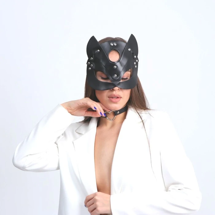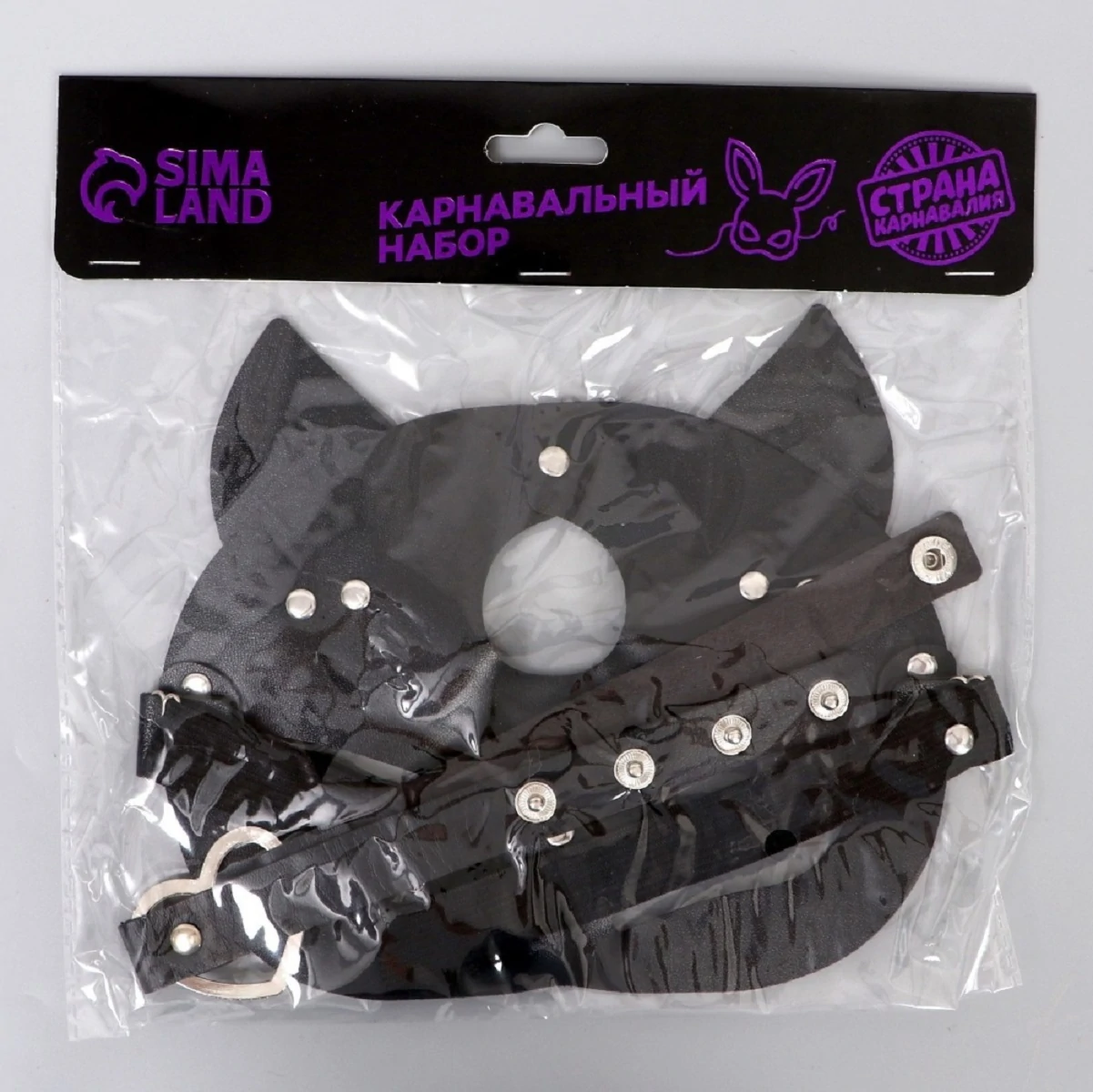Карнавальный набор Строгая киска, маска кошки и чокер с сердечком. Длина чокера 40 см. Высота маски 19 см, ширина 22,5 см. Цвет черный.