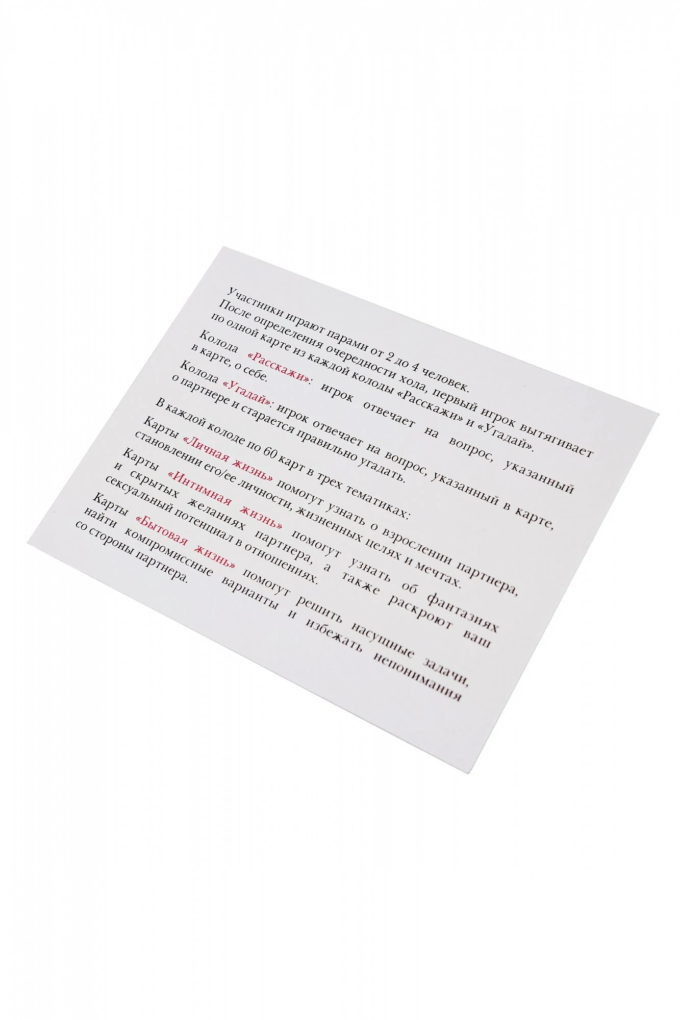 Игра Близкие люди - о искренности и настоящей близости. С помощью нее вы не только приятно проведете время и повеселитесь, но и укрепите отношения в паре! Как? Обсуждая важные вопросы личной, интимной и бытовой жизни, в форме игрового диалога по душам. 120 карт с заданиями, разбитых на две категории Расскажи и Угадай позволят раскрепоститься и довериться друг другу, ответить на самые сложные вопросы и обрести столь желанную гармонию в ваши отношениях. Правила: Участники играют парами от 2 до 4 человек. После определения очередности хода, первый игрок вытягивает по одной карте из каждой колоды Расскажи и Угадай. Колода Расскажи: игрок отвечает на вопрос, указанный в карте, о себе. Колода Угадай: игрок отвечает на вопрос, указанный в карте, о партнере и старается правильно угадать. Карты Личная жизнь помогут узнать о взрослении партнера, становлении его/ее личности, жизненных целях и мечтах. Карты Интимная жизнь помогут узнать об фантазиях и скрытых желаниях партнера.