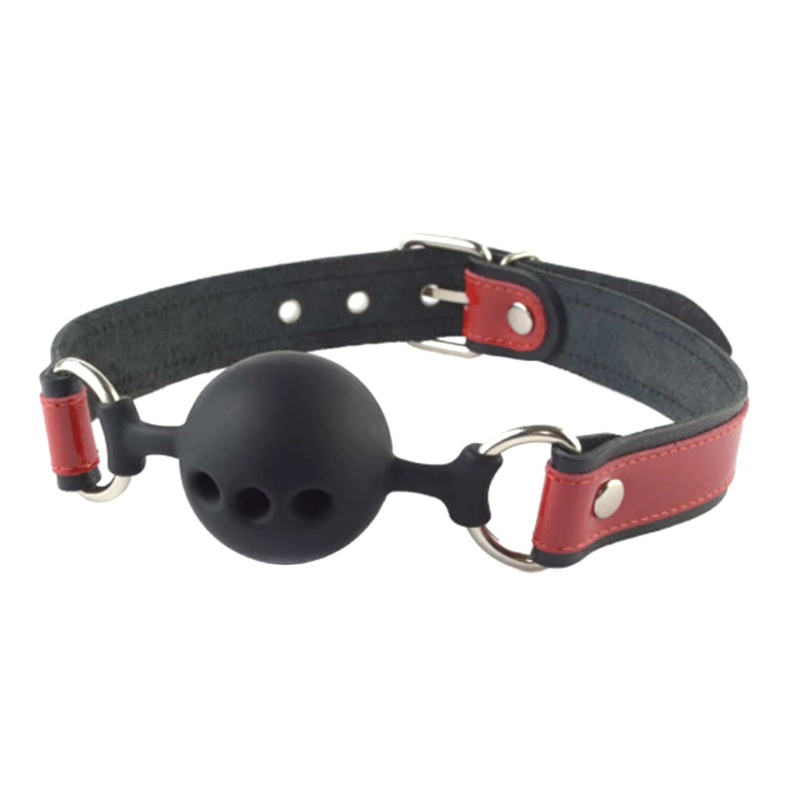 Кляп с оригинальным кожаным ремешком и лаковыми вставками красного цвета. Сам кляп-шар изготовлен из силикона, приятного на ощупь, со специальными отверстиями, пропускающими воздух. Ремешок с пряжкой позволяет подогнать изделие по желаемому размеру. Размер: длина 58 см, ширина ремешка 2,5 см, диаметр 4,4 см.