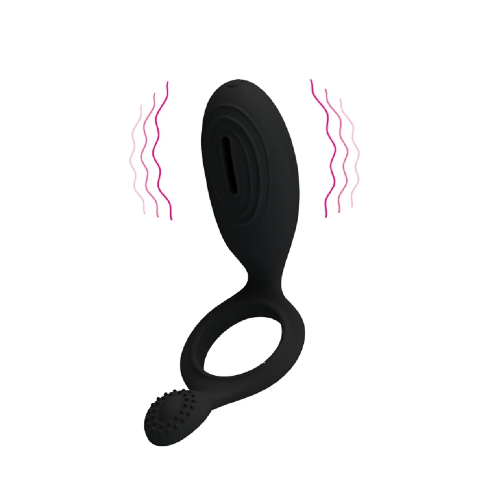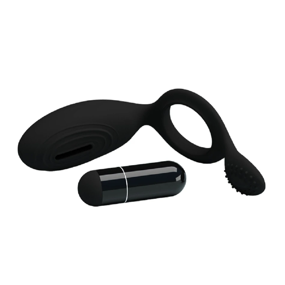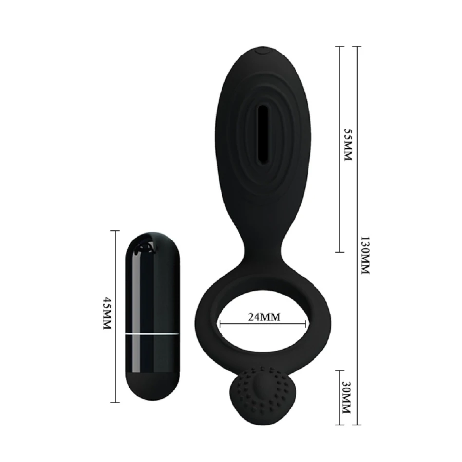Эрекционное кольцо с вибрацией является идеальной игрушкой, если вы хотите попробовать что-то новое. Игрушка выполнена из приятного на ощупь эластичного силикона. Эластичный материал будет плотно облегать основание вашего пениса, замедляя отток крови и тем самым помогая вам достичь более стойкой и продолжительной эрекции. Кольцо дополнительно имеет маленький текстурированный отросток для стимуляции мошонки и клиторальный стимулятор с вибрацией. Вибропуля съемная. Размеры: длина 13 см, клиторальный отросток - 5,5 см, внутренний диаметр кольца 2,4 см. Питание: 3хLR41 (в комплекте). Рекомендуемое время единовременного использования – до 30 минут. Цвет: черный. Для более комфортного использования рекомендуем приобрести смазку на водной основе и очищающий спрей Clear Toy 100 мл для обработки изделия.