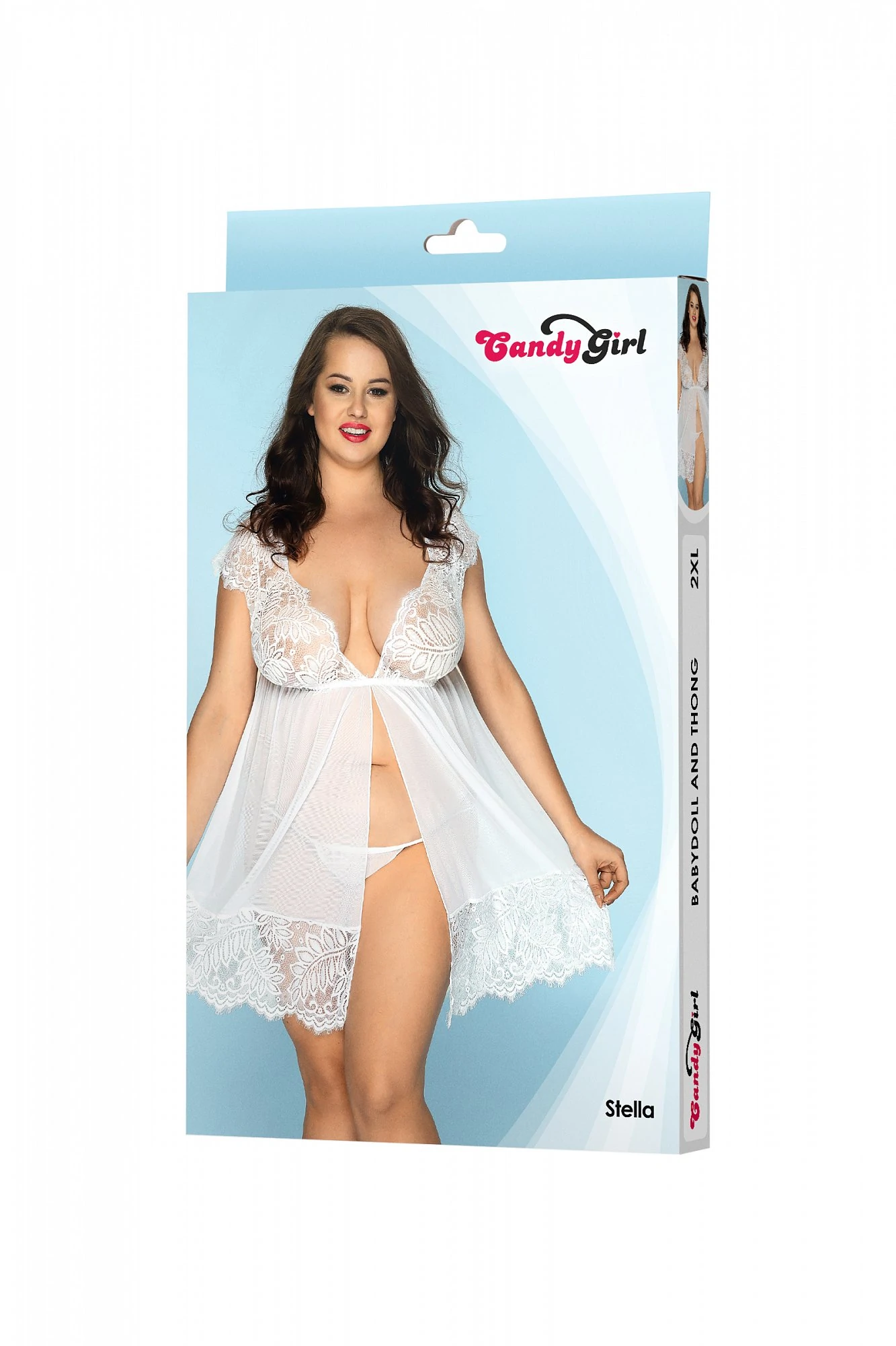 Нежный и изящный образ легко создать с комбинацией и Т-стрингами Candy Girl Stella. Силуэт бэби-долл зрительно удлиняет ноги, и переносит акцент на соблазнительную грудь. Глубокое декольте, вырез на спине и игривый разрез спереди открывают нежные участки тела для прикосновений и поцелуев. Образ притягательной соблазнительницы граничит с невинным обольщением. Изящное кружево подчеркивает гладкость и мягкость кожи. Пусть на первый взгляд образ в наряде Stella покажется неприступным, но завязки на спине помогают освободить грудь в считанные мгновения, а игривый, но откровенный разрез подола открывает доступ к самым интимным местам.