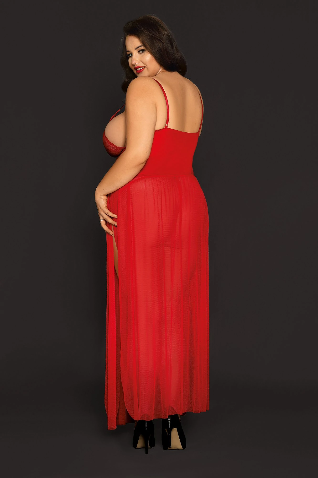 Длинная комбинация и Т-стринги Candy Girl Tabitha создают wow-эффект. Кружевной лиф визуально добавляет объем и поддерживает грудь. Вставки из трикотажной ткани и лаковой кожи плотно обхватывают талию, создавая точеный силуэт, а шнуровка и регулируемые бретели помогают достичь комфортной посадки. Четыре высоких продольных разреза струящейся юбки из полупрозрачной сетки зрительно удлиняют ноги и соблазнительно приоткрывают колени, бедра и ягодицы. Комбинация для дивы с шикарными формами идеальна для танца, романтического вечера или в качестве домашнего наряда. Размер: XXL (56). Цвет: красный.