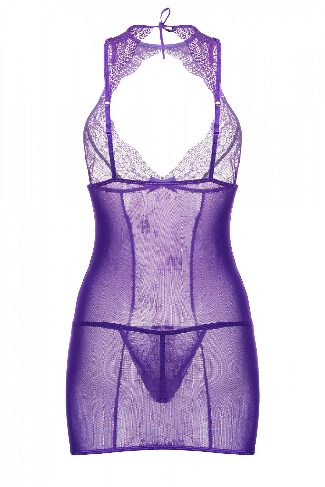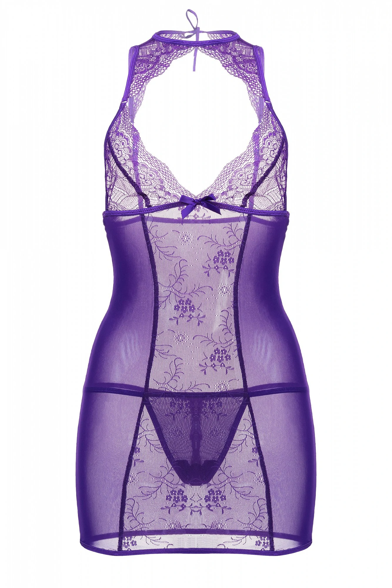 Комбинация из эластичной сетки с кружевной вставкой и фигурным декольте, украшенным сатиновым бантиком. Регулируемые бретели. Завязки на шее. Т-стринги в комплекте. Размер: универсальный. Цвет: фиолетовый.