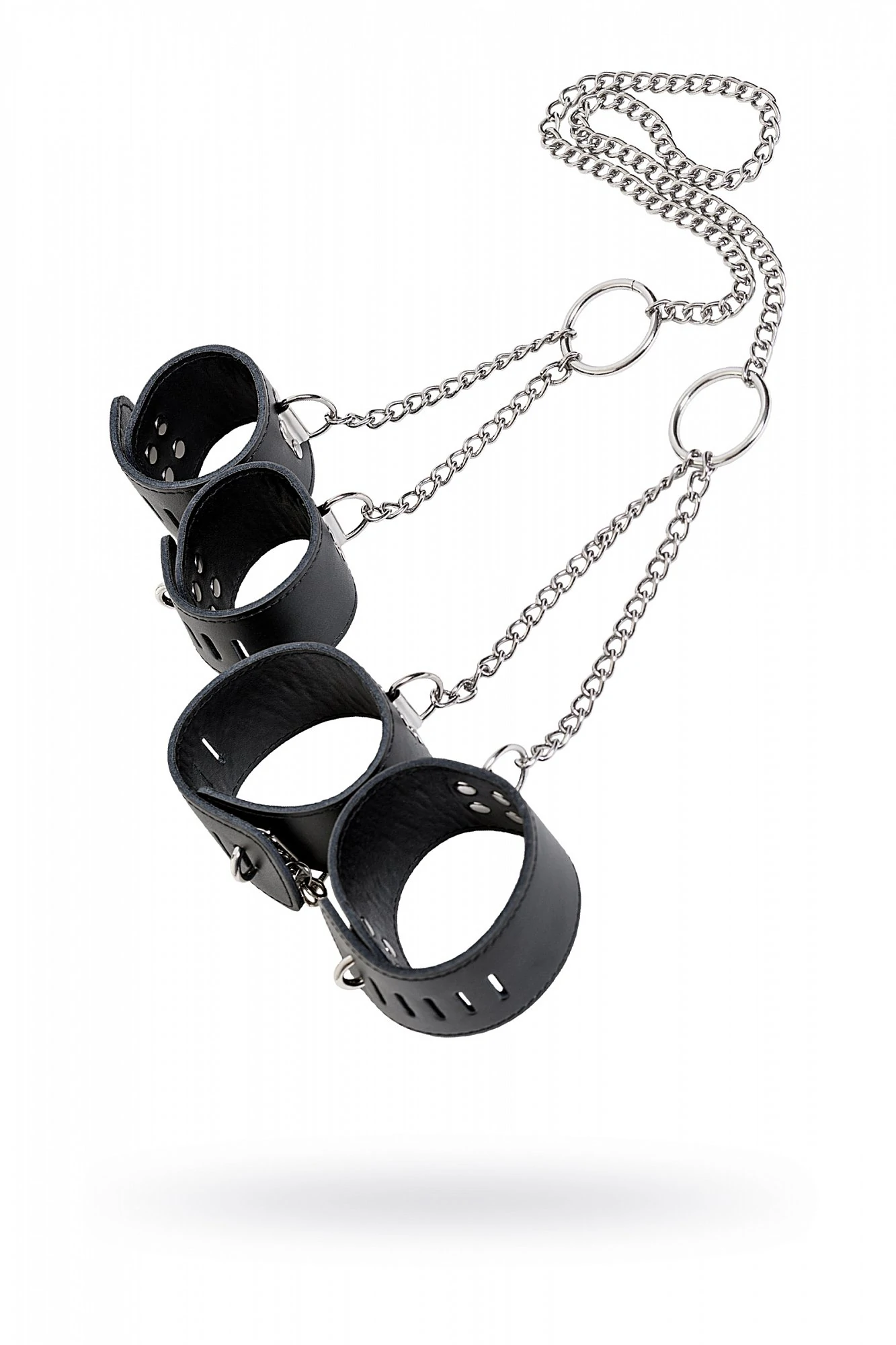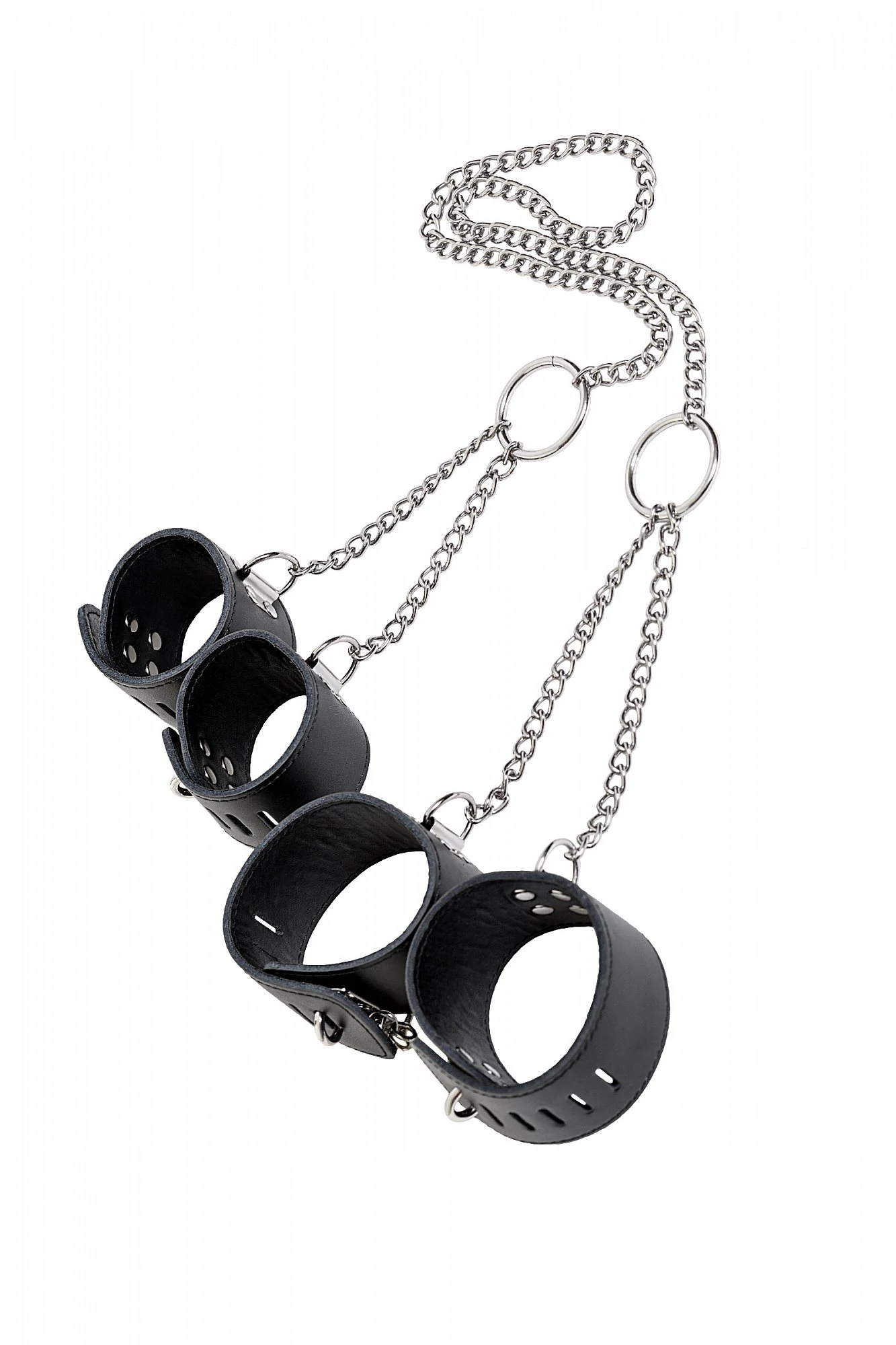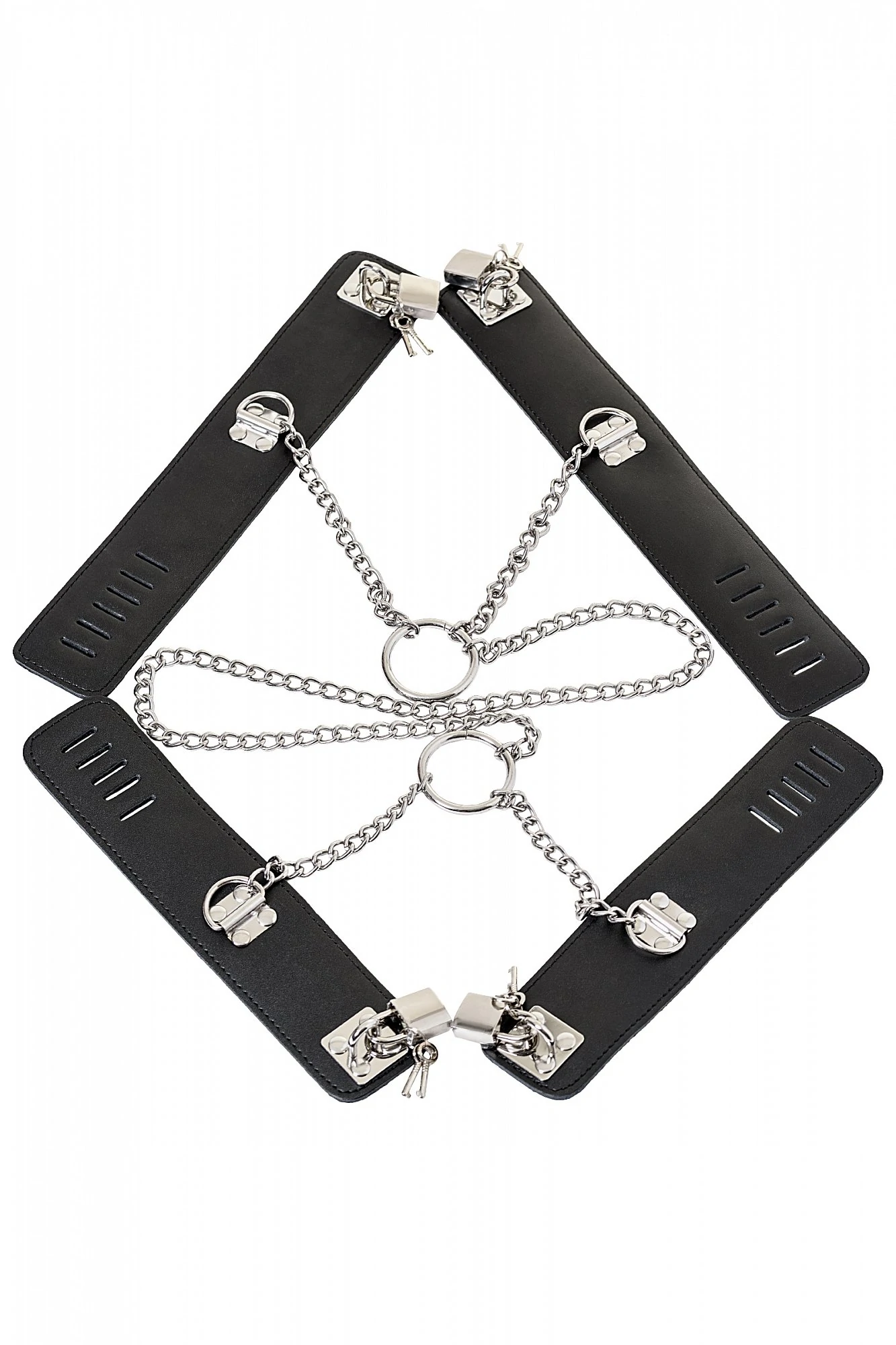 Кожаный бондажный набор: наручники и оковы на ноги, соединенные металлической цепочкой. Расстояние между наручниками и оковами по 25см, цепочка между руками и ногами 70см. Наручники и оковы фиксируются замками.