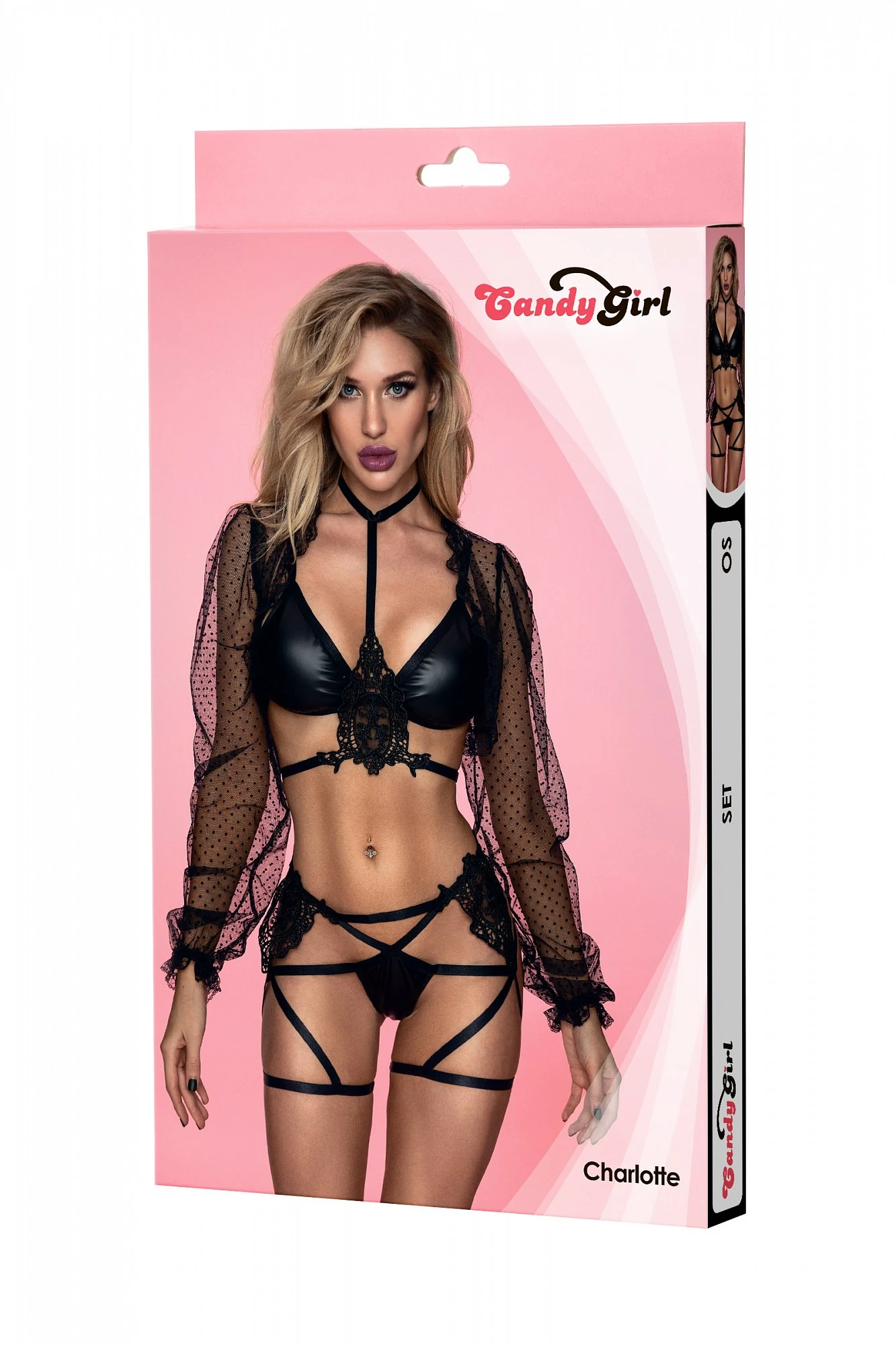 Комплект белья Charlotte – для многогранных натур. Дизайн и утрасовременное сочетание стреп, эластичного матового wetlook и кружева впечатлит самых требовательных женщин. Мягкий бюстгальтер с регулируемыми бретелями и застежкой на спине можно носить как дуэтом с трусиками, так и дополнять образ съемным стрепом с кружевной вставкой и регулируемыми застежками. Болеро с объемными рукавами идеально дополняет комплект.