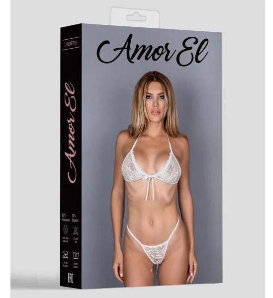Комплект эротического нижнего белья из коллекции Amor El, состоящий из белого кружевного бюстгалтера с брителями и ажурными стрингами на резинке с бантиками из тесьмы. Размер S/M (44-46). Цвет: белый.