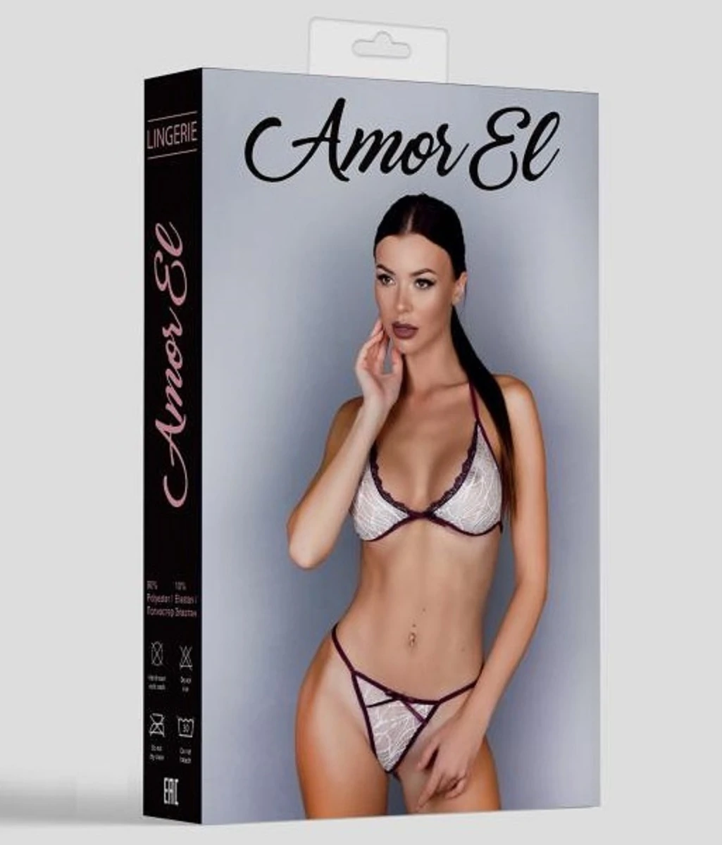 Комплект эротического нижнего белья из коллекции Amor El, состоящий из белого кружевного бюстгальтера с фиолетовыми бретелями и ажурными стрингами на фиолетовой резинке с бантиками из тесьмы. Размер S/M (44-46). Цвет: белый и фиолетовый.