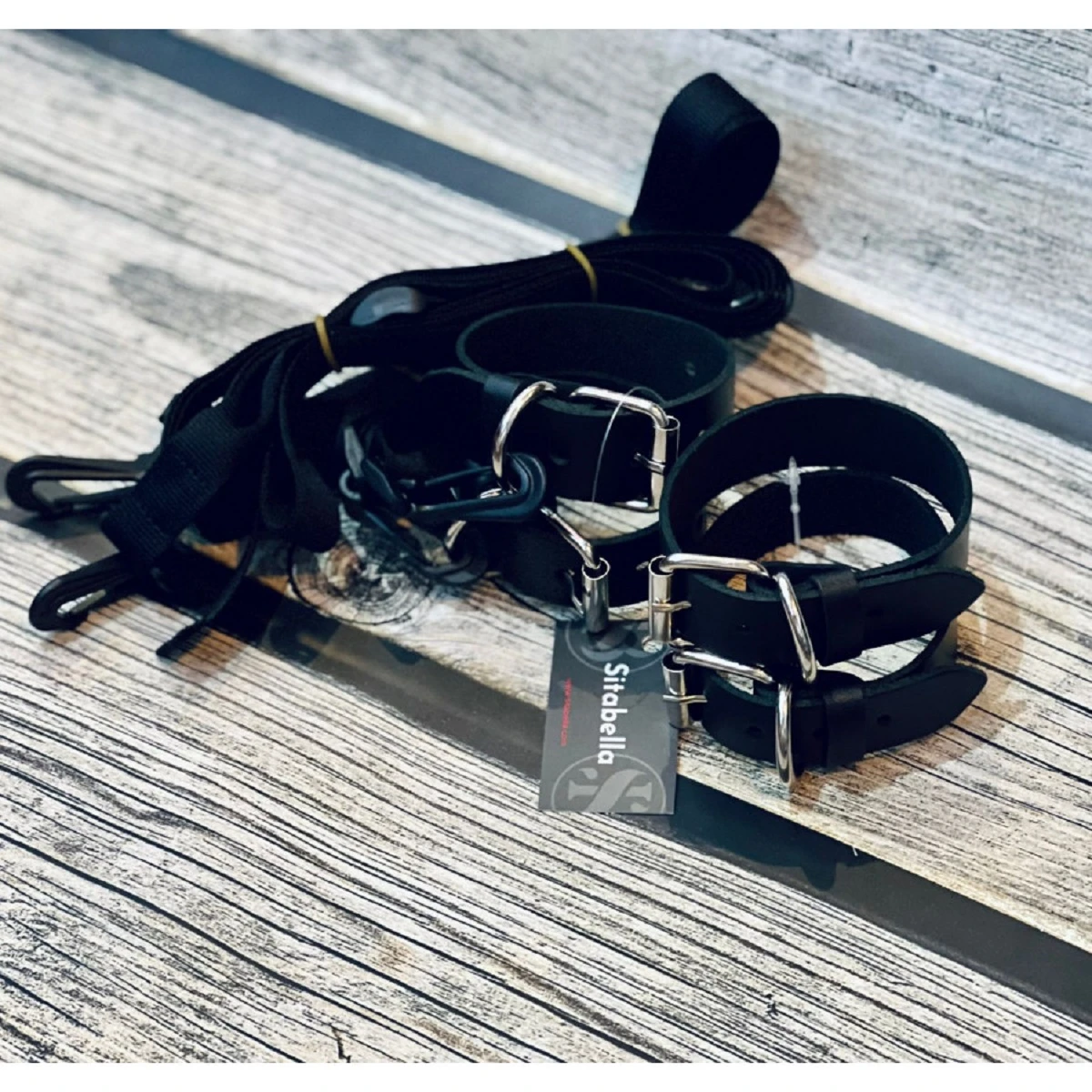 В комплект входят наручники, оковы и две растяжки на кровать. Длина каждого ремешка 2,7 м. Наручники и оковы из натуральной кожи крепятся к ремешкам при помощи прочных пластиковых карабинов. Цвет черный.