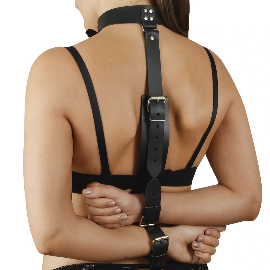 Изящное решение для фиксации в процессе эротических игры в формате БДСМ. Комплект-фиксатор Новичок от Sitabella изготовлен из натуральной кожи и металлической фурнитуры. Изделие регулируется, что позволяет откорректировать размер под различный рост. Ошейник и наручники зафиксированы на основе (не съемные). Регулируются также металлическими пряжками. Размер: максимальная длина основы 48 см, длина ошейника 42 см, ширина 3 см; длина наручников 22 см, ширина 2,5 см. Цвет черный.