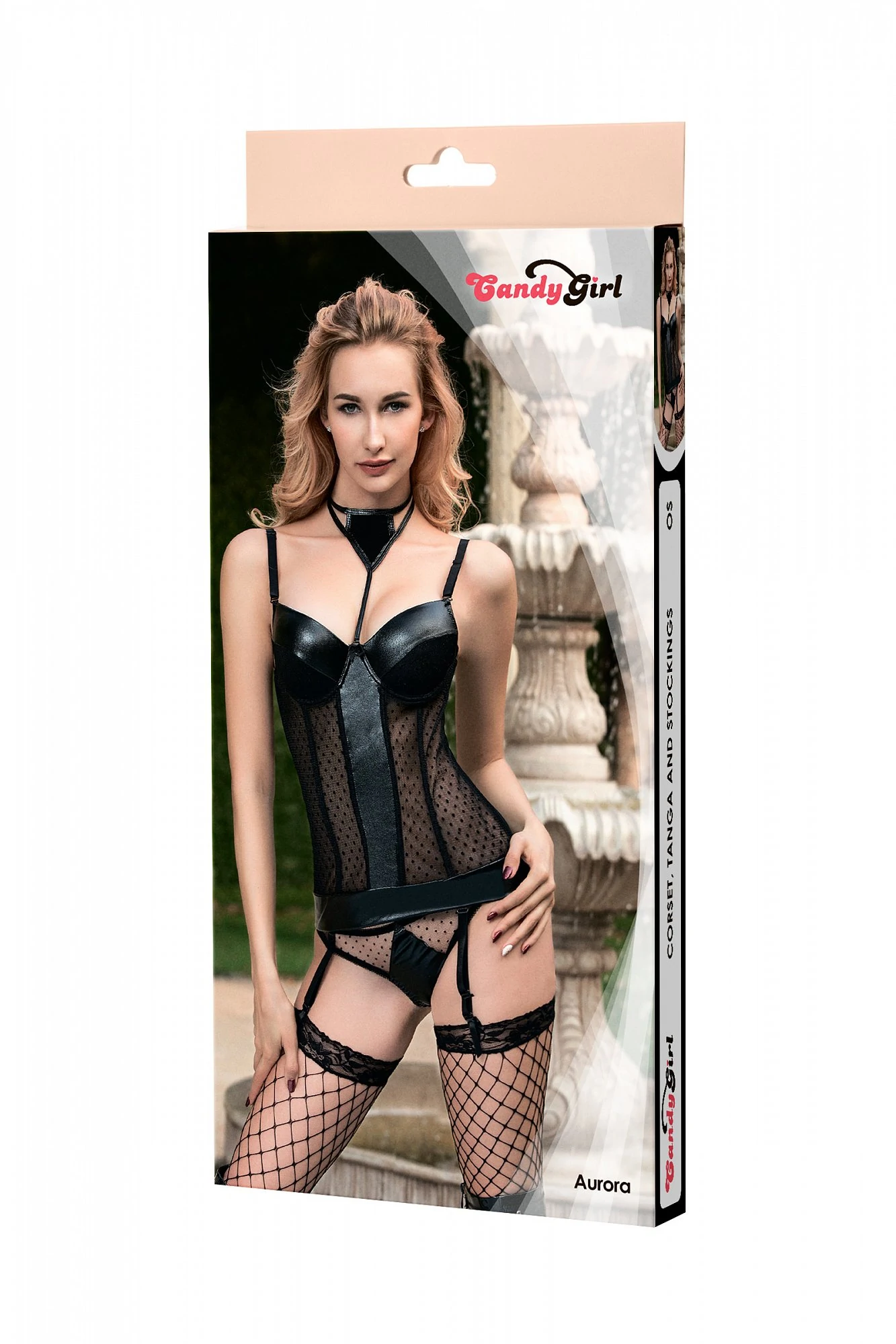 Корсет с плотными чашками Candy Girl Aurora визуально увеличит объем груди и добавит стройности силуэту благодаря продольным косточкам и съемным регулируемым пажам. Сочетание эластичной сетки, кружевного полотна с точками и ткани wetlook с тиснением «под кожу» порадует любительниц интересных фактур. Регулируемые съемные бретели и многорядная застежка на спине обеспечат идеальную посадку. Съемный пластрон, трусики-танга и чулки из крупной сетки с уплотненными мысками идеально дополнят образ.