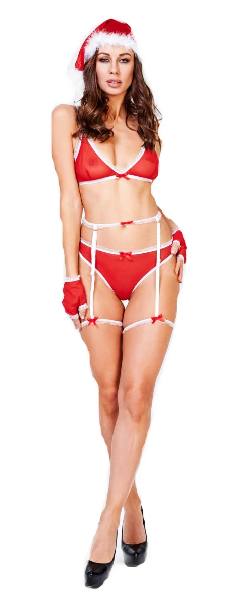 Соблазнительный комплект идеально подойдет для новогоднего эротического вечера вдвоем. Комплект: бюстгалтер, пояс с подтяжками, трусики, перчатки, шапка. Размер: M/L. Цвет красный с белым.