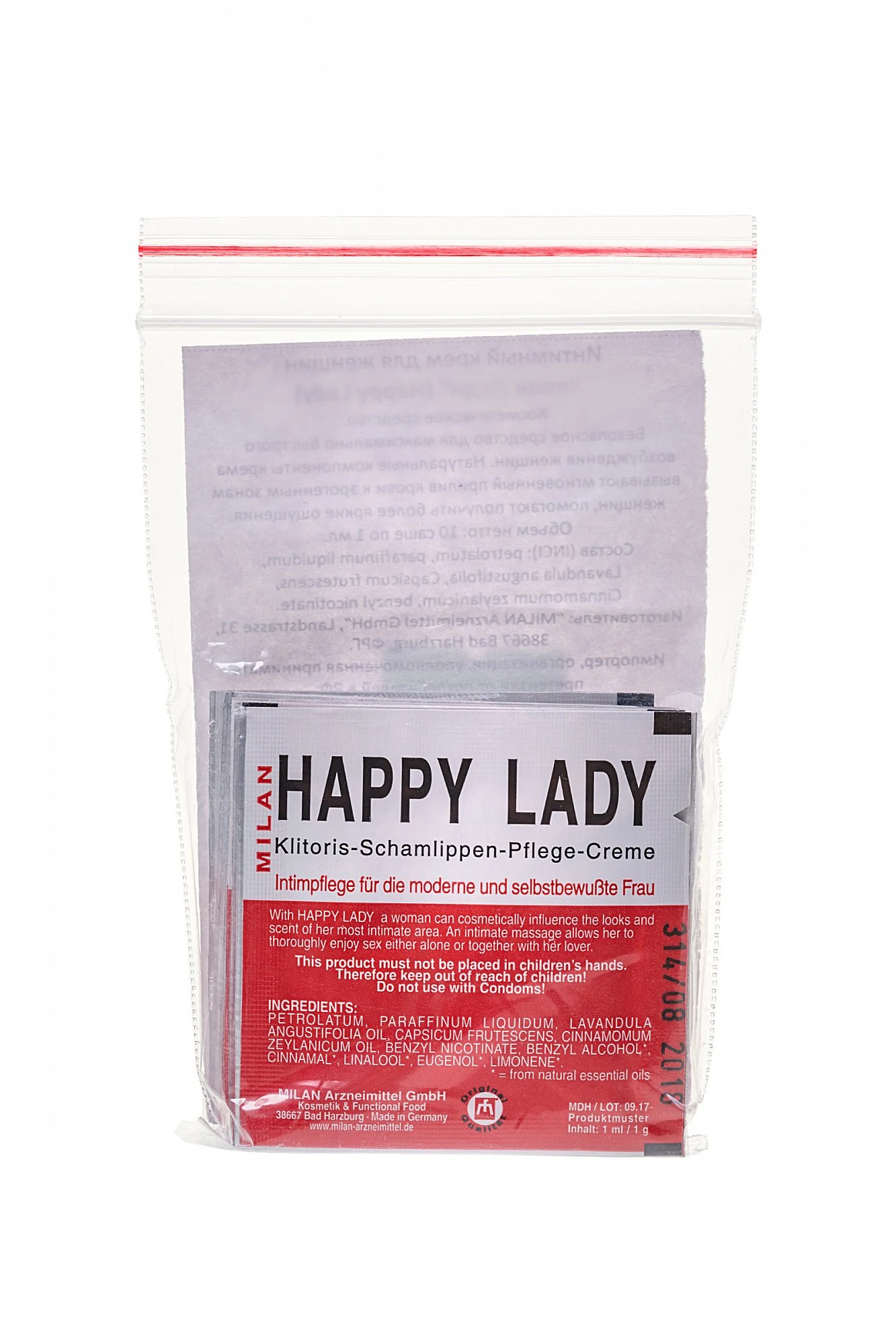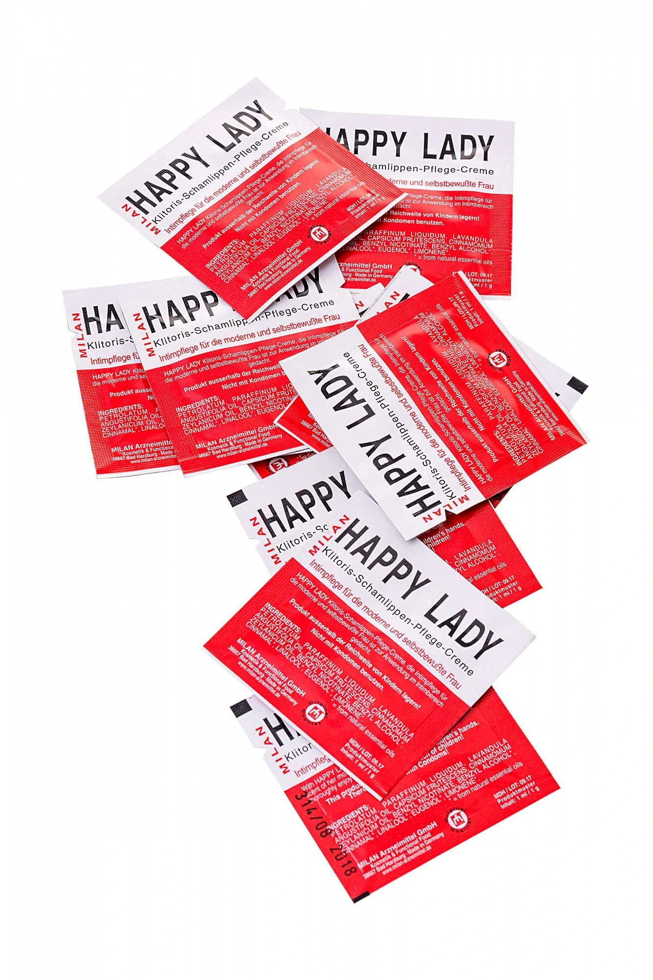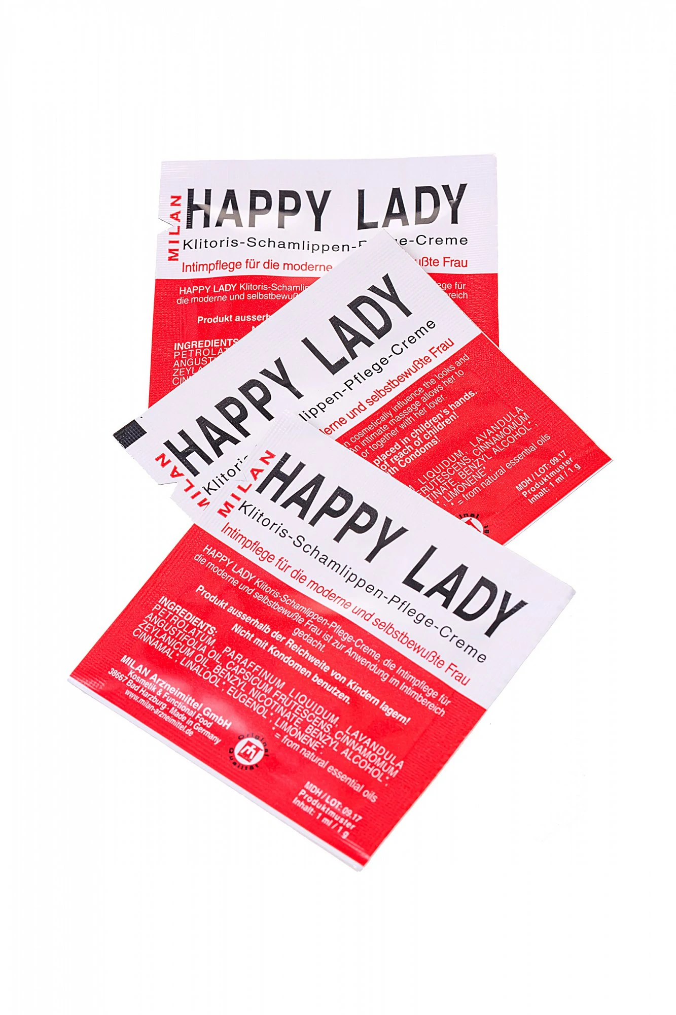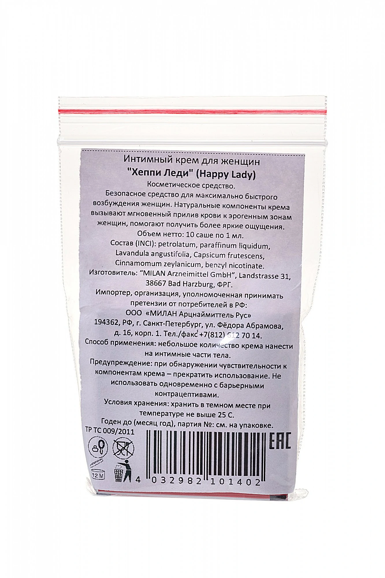 Интимный крем для женщин ''Хеппи Леди'' (Happy Lady). Крем является результатом многолетних разработок, целью которых было создание местного безопасного средства для максимально быстрого возбуждения женщин. Специальные компоненты крема вызывают мгновенный прилив крови к эрогенным зонам женщин, помогают получить более яркие ощущения. Способ применения: выдавить крем и нанести на наружные половые органы перед близостью. Объем: 1 мл.